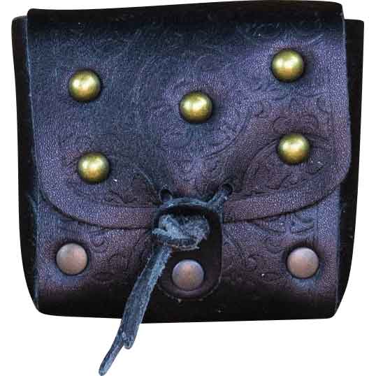 On the front, there is a flap with a rounded bottom edge. It fastens closed with a cord that ties through a leather toggle. Brass-colored rivets adorn the front flap. In addition, an embossed pattern adorns the front, back, and sides of the bag. This pattern combines circles and fleurs-de-lis. The bag is perfect for keeping your coins, roleplaying dice, or other small pieces of gear.