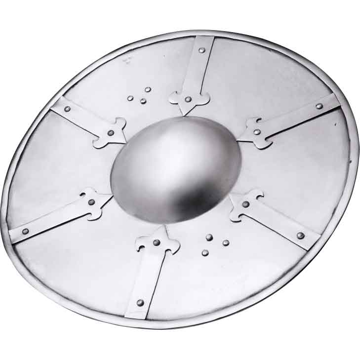 Young infantryman, carry your sword and buckler into battle. The Large Fleur Shield Buckler will keep you armed and protected during the fight ahead. Made of 14 gauge steel, this round buckler is not pre-treated with oil. The buyer can oil it, if desired. The front of the buckler features riveted strips ending in fleur-de-lys style shapes. It also has a built-in boss. The back of the buckler has a wooden grip pinned to a steel handle. The steel handle is riveted to the buckler. This medieval buckler is great for historical reenactments and cosplay conventions.