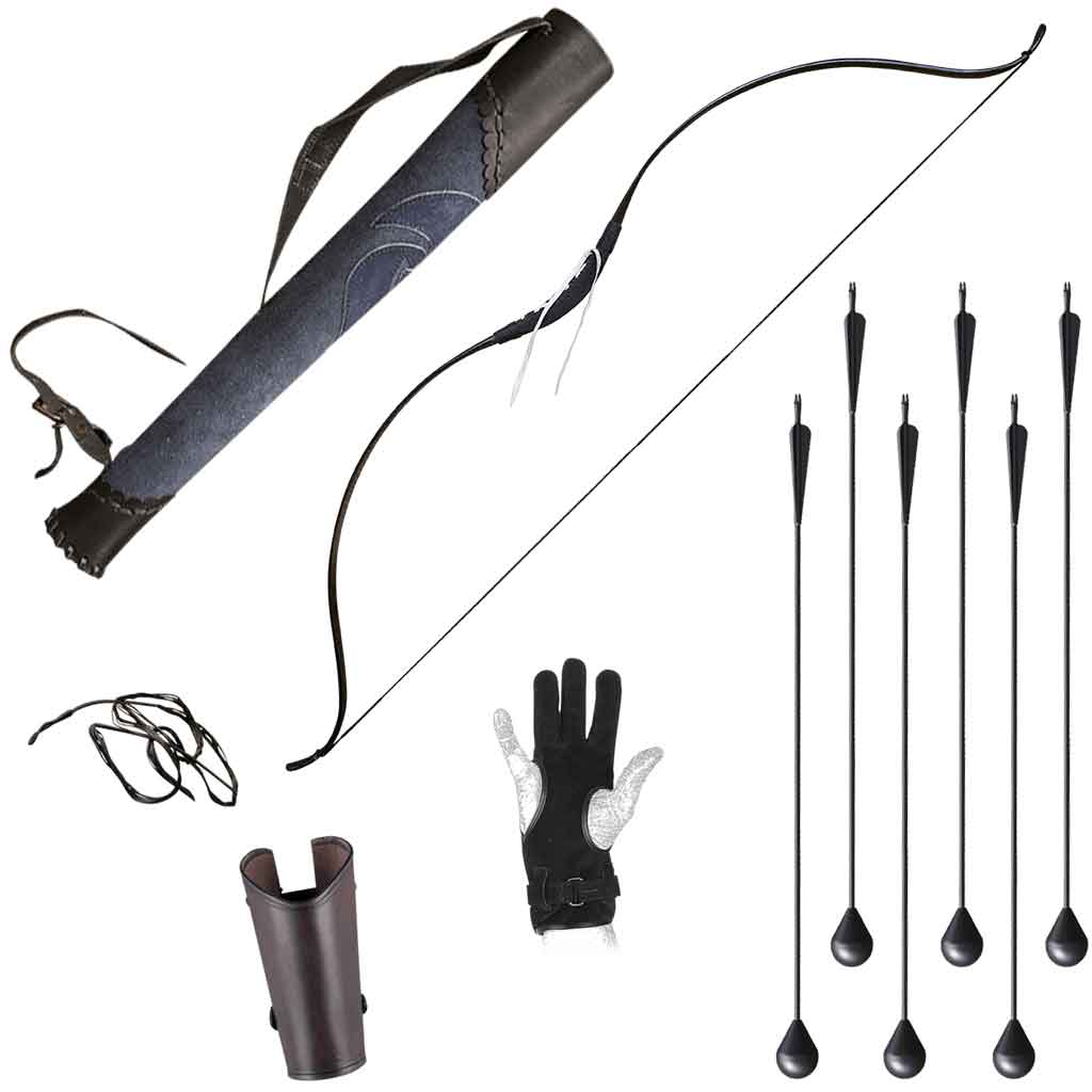 - Includes a bow, guard, glove, quiver, extra string, and six arrows