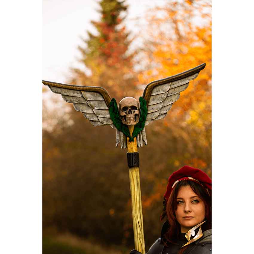 This LARP standard top is designed like a winged skull with a laurel wreath. The wings are painted white and gold with textures designed to look like feathers. In the middle, the skull is a grim reminder that even the greatest heroes on the battlefield are mortal. The skull has realistic features like eye sockets and a jaw. Around the skull sit green laurel leaves, a symbol of victory and martial prowess.