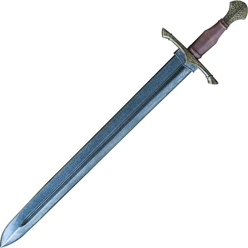 Become the Elven guardian of the woodland, or lead fellow adventurers through a cursed forest in the guise of a huntsman. Whatever path you choose, the LARP Ranger Sword lends you strength when battling within an enchanted realm. Crafted from closed cell foam around a solid fiberglass core and finished with a strong latex coating, the double-edged blade withstands the common stresses of LARP warfare. A fuller lightens its weight while strengthening its design. Hand painted detail enhances the realistic appearance of the polyurethane handle. An antiqued golden finish covers the cruciform hilt, and a sculpted leather-like wrap strengthens the grip.
