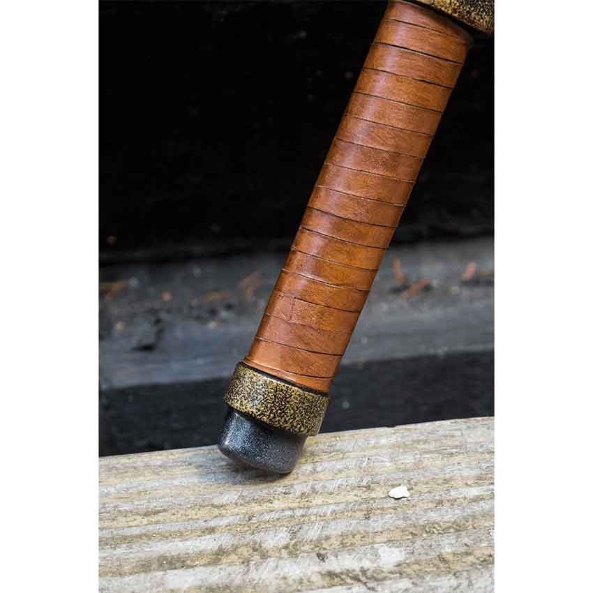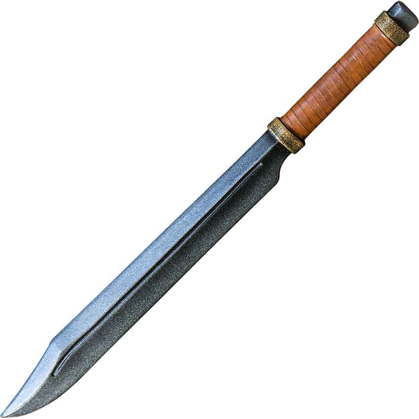 The scramasax was a classic knife of the medieval ages that Vikings used for virtually everything, from battle to camping, and more. Now, you too can enjoy that same versatility in a side-arm, any time you go into battle with the LARP Scramasax at your side. Like the classic scramasax, or seax, of Viking use, this knife has a simple hilt, featuring a rounded, negligible guard and flattened disc pommel. The blade, on the other hand, gets all of the focus, possessing a broad, cleaving shape that features a simulated fuller down the spine of the blade. The blade also has a clipped point, which makes this knife look like it would excel at both slashing and stabbing. Only this knife is not made for actual cutting of stabbing of any kind, because it is constructed not from steel, but from LARP safe materials! It is crafted from an extremely durable foam that does not shred, which has been sealed within a strong coating of latex. As safety is always a concern in LARP, this weapon also features a round, flexible fiberglass core that bends and flexes. The core also features a durable Kevlar cap for added protection, both against the core and for when the weapon is used to stab.