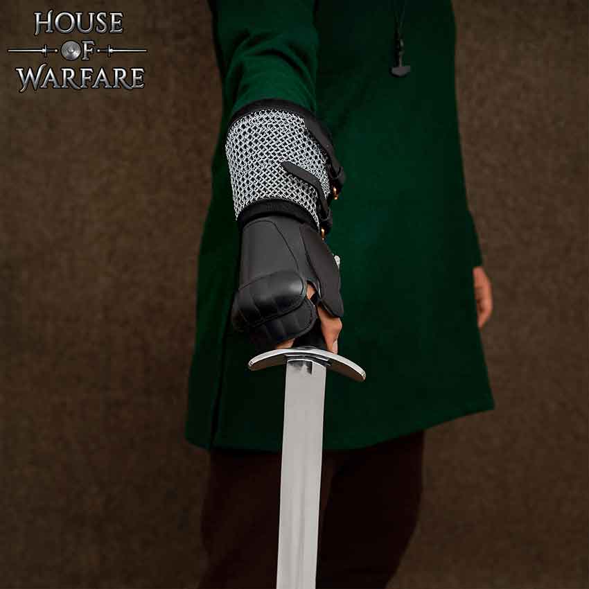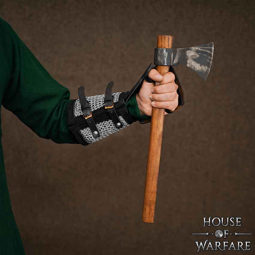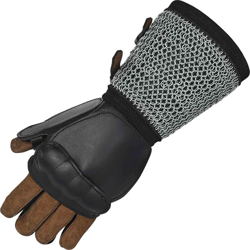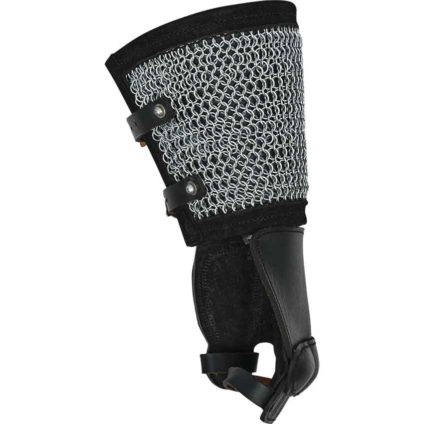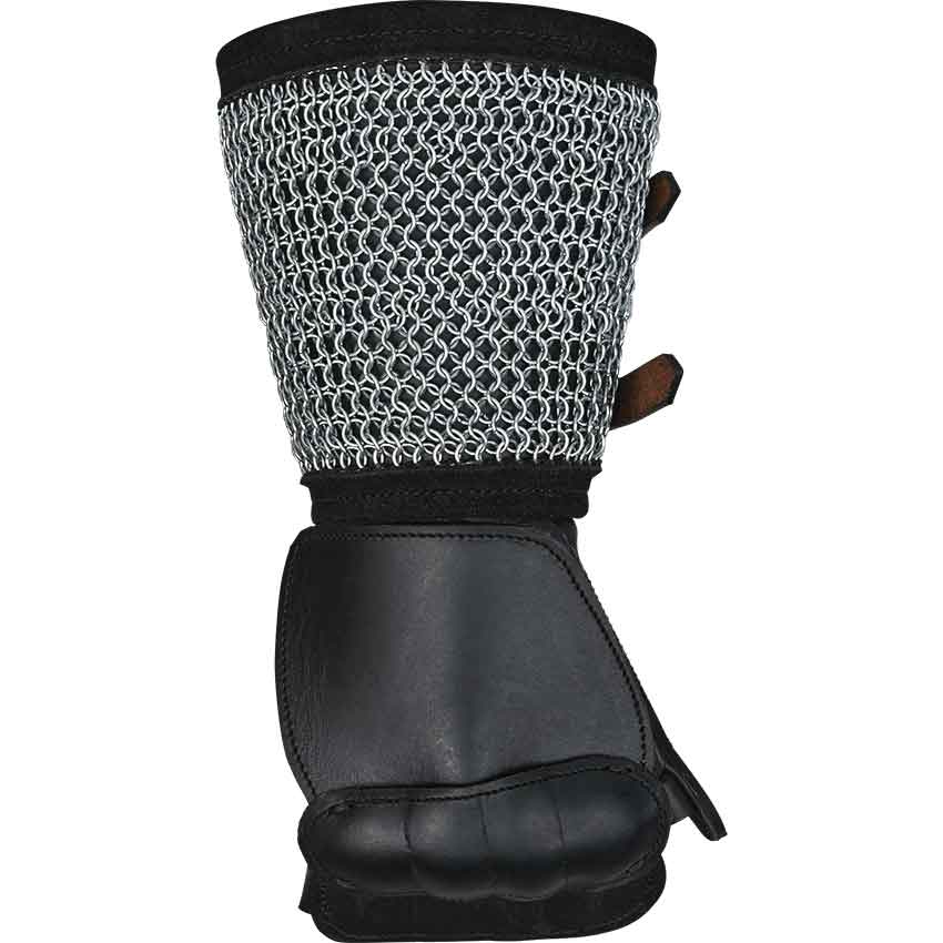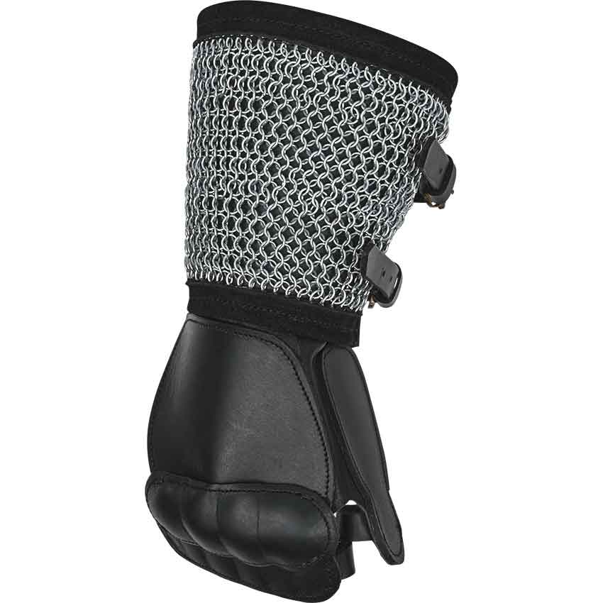 A thicker piece of leather forms a wrist cuff. Black suede trim runs along the edges of the cuff. Silver-colored aluminum chainmail covers the outside of the cuff. This cuff secures with adjustable buckled straps. Meanwhile, there are leather loops at the knuckles and thumb for securing the medieval leather armour to the fingers. This single armour gauntlet is ideal for any reenactment, LARP battle, or cosplay. Wear it with the Brown Leather Swordsman Gloves for a comfortable fit as shown, sold separately.
