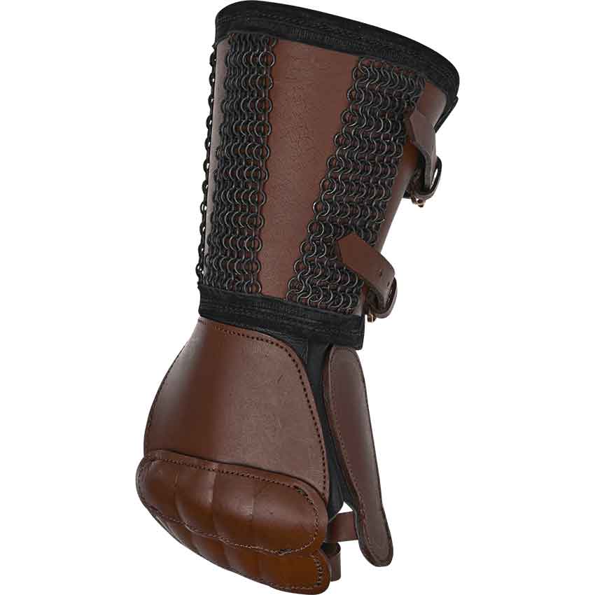 The Brown Leather Gauntlet with Chainmail Cuff makes a great addition to your armour for any adventure or important quest. Made from leather, this medieval gauntlet protects one hand. You can get it in either a left- or right-hand version, allowing you to pick what best suits your character and fighting style.