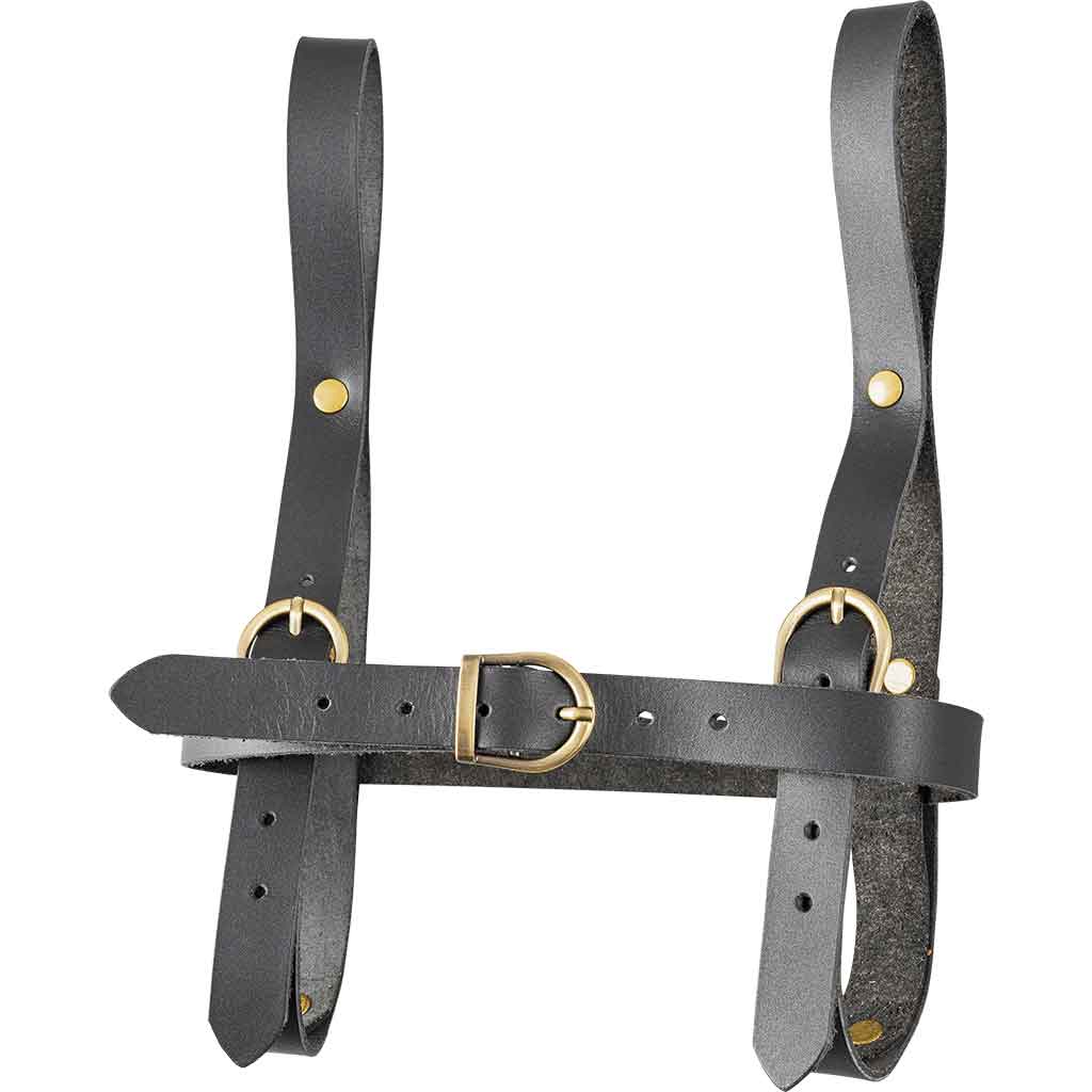 Designed to hold books securely from three sides, your spellbooks are safe and accessible during your quests. The design is three buckled straps connected together. Each buckle has a design that combines the frame and belt loop into one piece. The straps are two inches wide. The two top straps have belt loops that accommodate most belts. At the bottom, the third strap can be adjusted to keep your book in place during your travels.