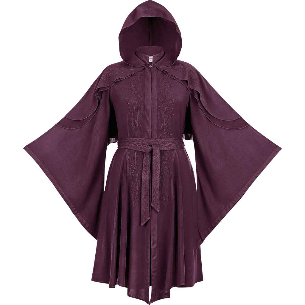 At the top, the purple womens coat has a short collar surrounded by a rounded hood. Radiating out from the collar is a layered capelet that elegantly lays onto the long angel sleeves. Leafy embroidering runs down the center front and along the front of the capelet.