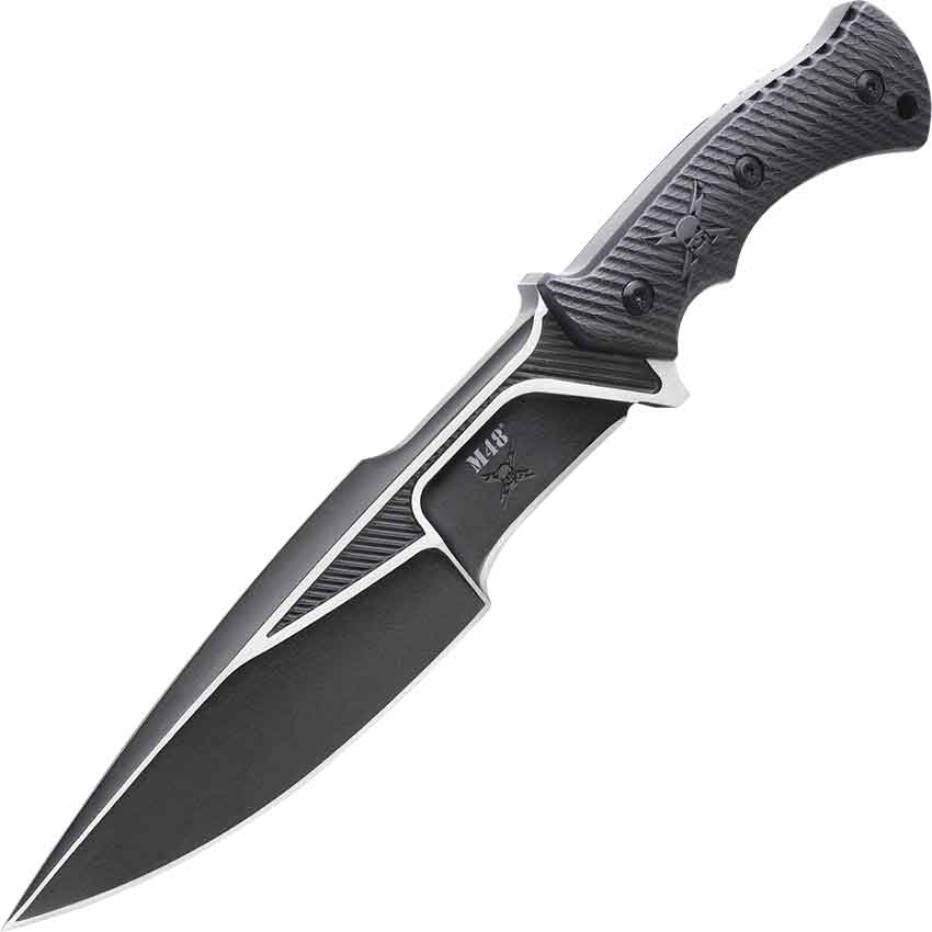 Screwed to the tang at three points, the handle is made of G10 fiberglass laminate. Upon closer inspection, the iconic M48 skull with crossed lightning bolts is embossed near the concave finger grooves. These finger grooves give you an ergonomic and sturdy grip. At the bottom of the rounded pommel is a lanyard hole. Moving down the length, the fully sharpened drop point blade has a distinct grind. More specifically, the blade near the heel has been almost completely hollowed out where the M48 logo and the classic skull are displayed. The inside of the blade, with the white trim, has intricate diagonal grooves for added depth to the design.