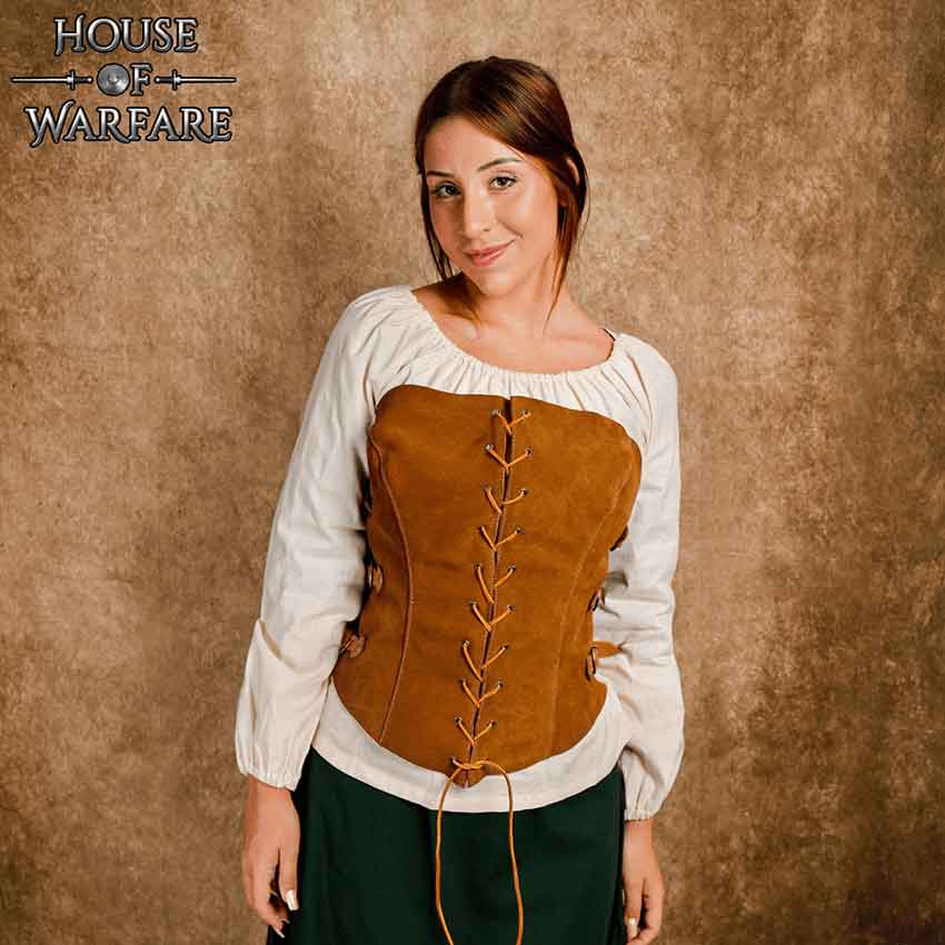 Made from high-quality suede, this corset is both comfortable and durable. The rounded hem in the front adds a feminine touch, while the rich brown color exudes sophistication. Whether you are attending a medieval banquet or engaging in an epic battle, the Maidens Suede Corset is a must-have for any historical-inspired outfit.