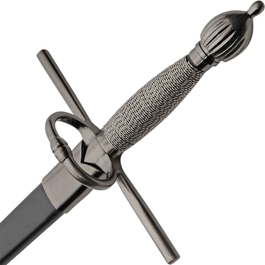 Starting at the cast metal hilt, the fluted acorn-shaped pommel tapers into a button for extra style while providing balance. The wire-wrapped grip offers a secure hold, enhancing control during demonstrations.