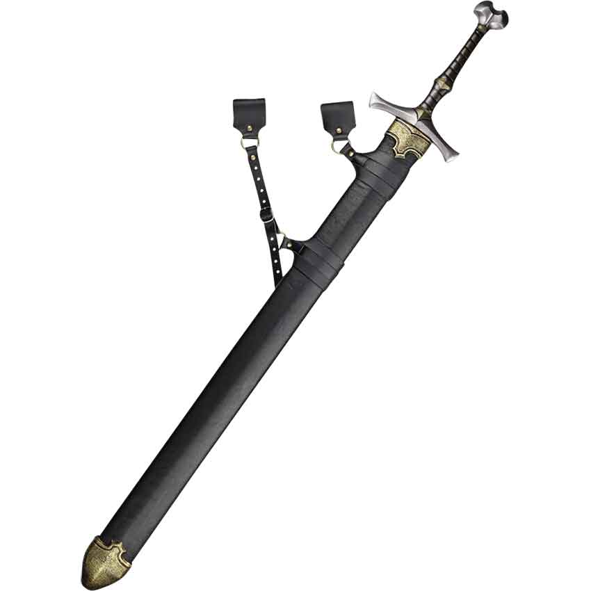 The leather-wrapped scabbard hangs from a pair of loops connected with straps and rings. One loop is longer than the other. This allows the long scabbard to hang at an angle on a belt, not included. Both loops are adjustable. You can choose for the scabbard to hang as a left- or right-hand draw.