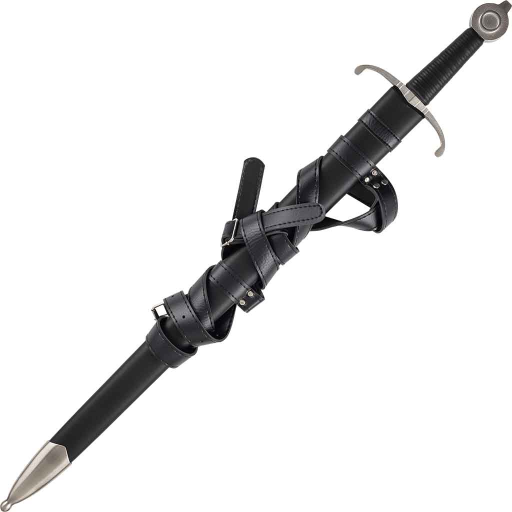 This medieval steel sword comes with a black leather-wrapped scabbard. There is a notch and a felt tab at the throat for accommodating the quillon block in the crossguard. For added convenience, there is a sword frog already attached to the top of the scabbard. It can easily attach to your sword belt. Simply slide it on and adjust to your preference. The sword frog is black to match the scabbard and is designed to hold your sword at an angle for historical detail. There is a stainless steel endmount at the bottom that ends in a round finial to ensure the tip doesn’t poke through.