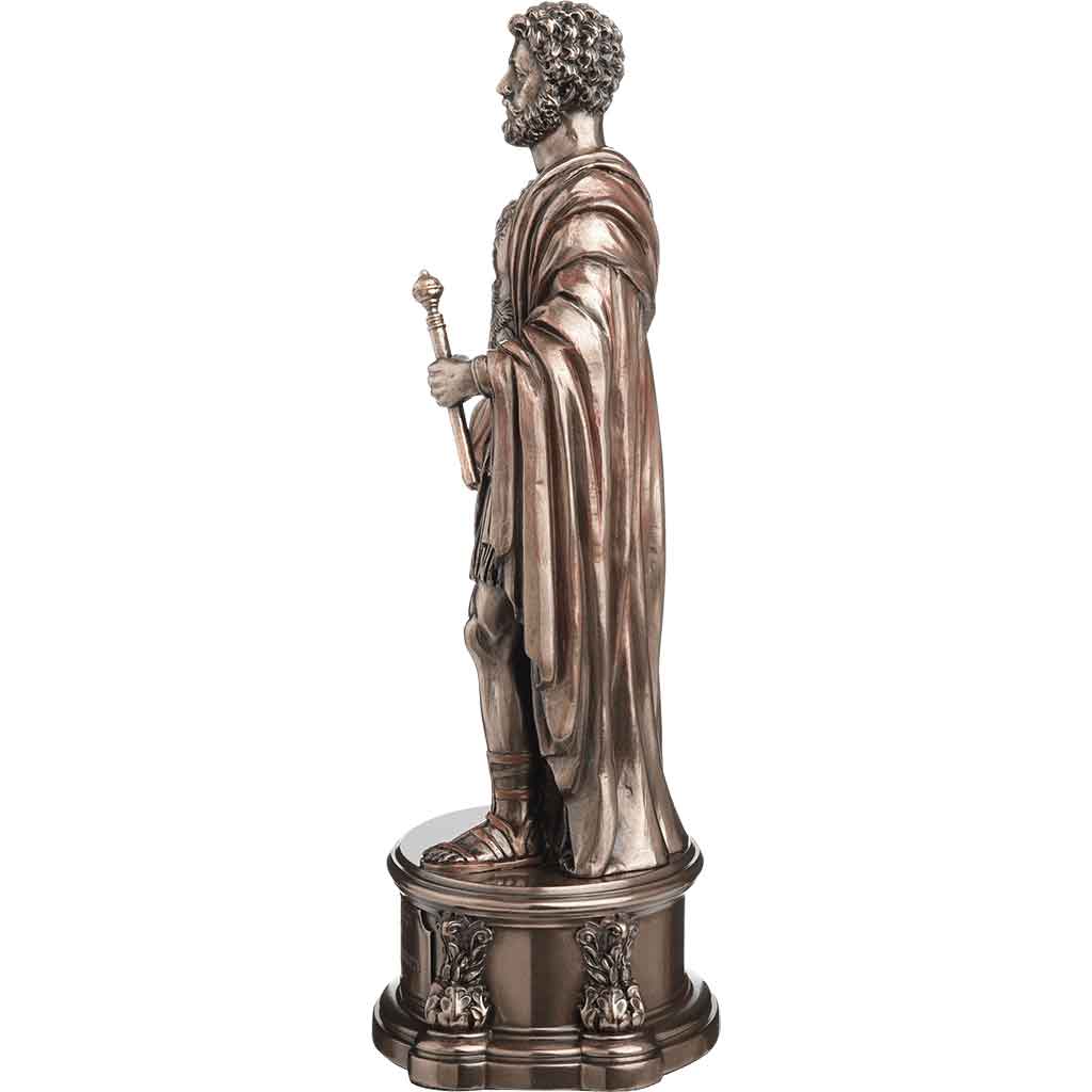Made from cold-cast bronze, this statue is a detailed depiction of Marcus Aurelius Antoninus, a Roman emperor renowned for his judicial reforms, military achievements, and for authoring the collection of Stoicist teachings known as “The Meditations.” Cold-cast bronze is a resin composite that utilizes powdered bronze to create a sculpture that is lightweight like resin, but possessed of a metallic bronze luster. The statue depicts the emperor in a standing dignified pose as if ready to address his subjects on the streets of Rome.
