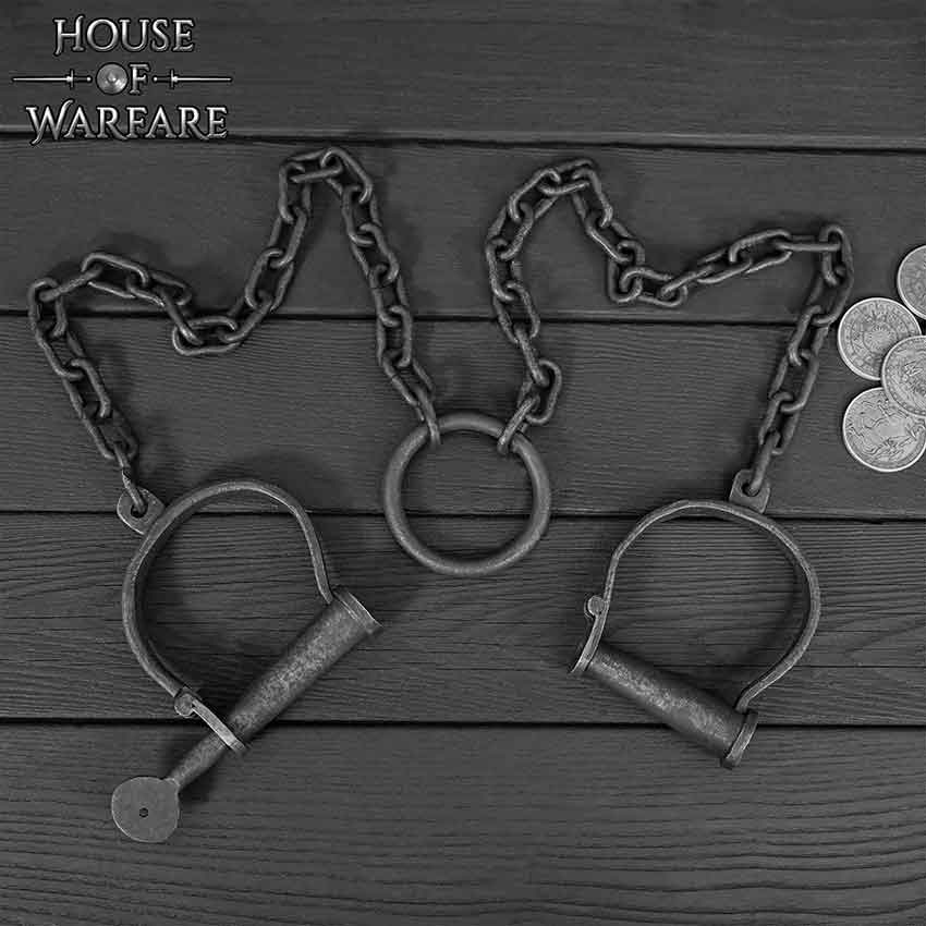 Whether you are a dungeon master or Wild West sheriff, you will need a way to keep your prisoners from escaping. Use the Medieval Legcuffs with Chain. The pair of medieval style cuffs have a rusty brown finish. They are horseshoe-shaped at the ends. Each cuff attaches to a chain. A ring in the center connects the two chains. The cuffs come with a key that opens the cuffs with a few twists. This key allows you to use them for a variety of uses. Display the Medieval Legcuffs with Chain in your home for a conversation starter. You can also use them in a theatrical production or for a reenactment display.