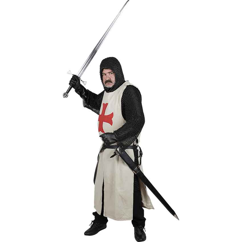 For those looking to complete their transformation, optional accessories are available to enhance the authenticity of your appearance. An arming cap ensures comfort under your chainmail, while a ring belt, gloves, and boots add layers of detail to your crusader persona. And what would a knight be without his sword? Our knights outfit offers a fully functional sword and a pair of leather loops to hold it securely by your side.