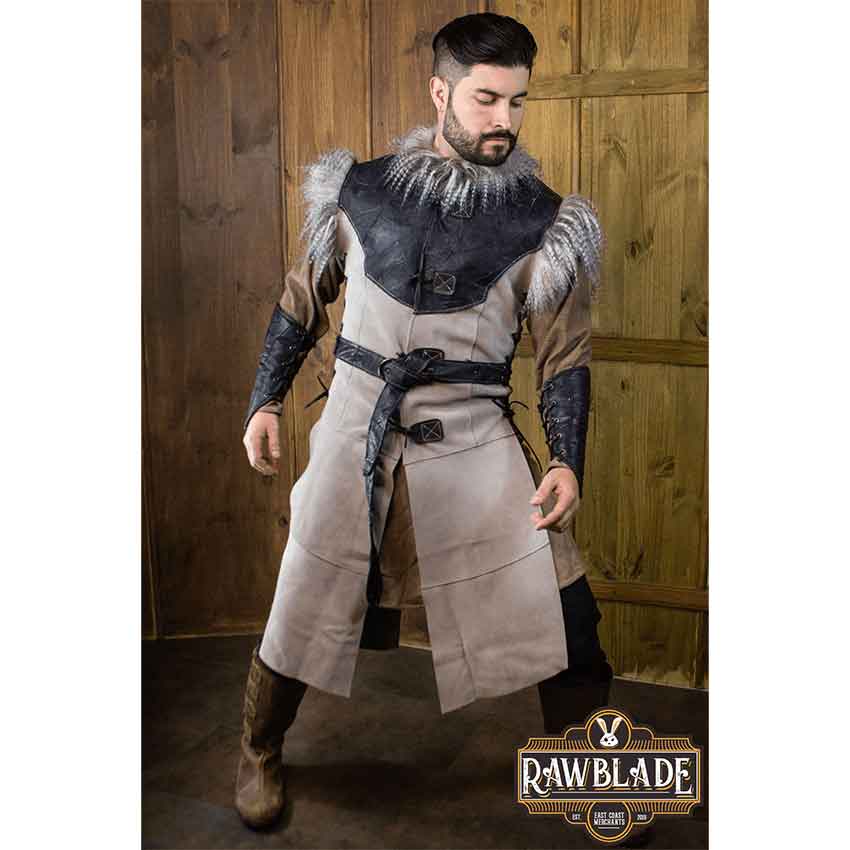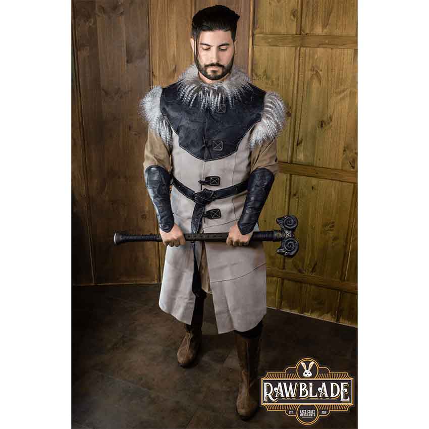 Below the collar, the medieval fantasy jerkin has a black patchwork section of leather that covers the upper chest in front and back. It contrasts with the suede-like texture of the rest of the grey medieval mens clothing. This patchwork style adds an experienced, fierce look. In addition, the jerkin has long faux fur trim forming cap sleeves at the top of the shoulders.