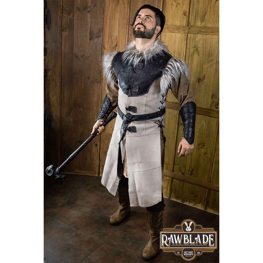 Made from split leather, this grey fantasy tabard comes in multiple sizes. It fastens in front with leather ties. The medieval mens jerkin also laces up the sides with leather ties. At the top, there is a short collar. Faux fur runs along the collar. It has a striped, grey pattern, resembling owl feathers.