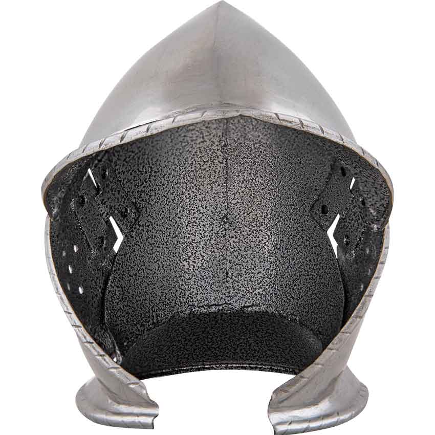 Our Miniature Warrior Burgonet Helmet is a functional miniature 16th century light burgonet helmet characterized by its high skull, brow peak, and hinged ear pieces. This type of helm allowed for excellent vision and was usually worn with a buff. The Miniature Warrior Burgonet Helmet is hand crafted and made of carbon steel, just like the real, life sized versions that are fully functional. This Miniature Warrior Burgonet Helmet is quite an impressive helmet and makes a great addition to any medieval collection. Easily display it in the home or office on a shelf, table, or dresser. This miniature helmet includes a helmet display stand.