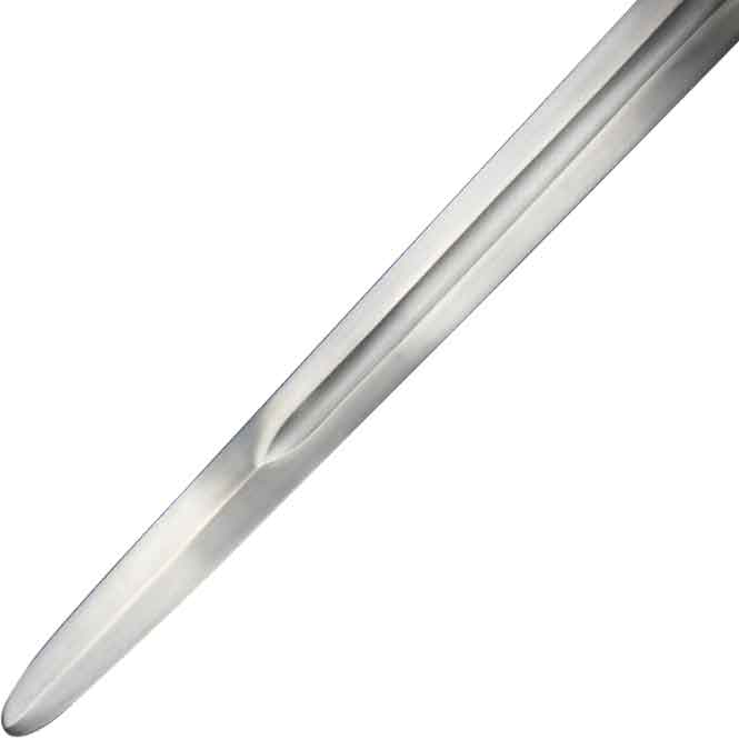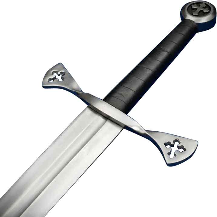The unsharpened, double-edged blade has a rounded tip. This makes it great for blade-on-blade contact sparring. A fuller runs all the way down the length. The steel crossguard has a twisted design and ends in quillons with cross cut-outs. Made of wood and wrapped in leather with a spiraling pattern, the handle accommodates a secure grip. At the bottom, the peened disk-shaped pommel adds strength and a counterbalance to the sword. Like the quillons, the pommel has a cross accent.