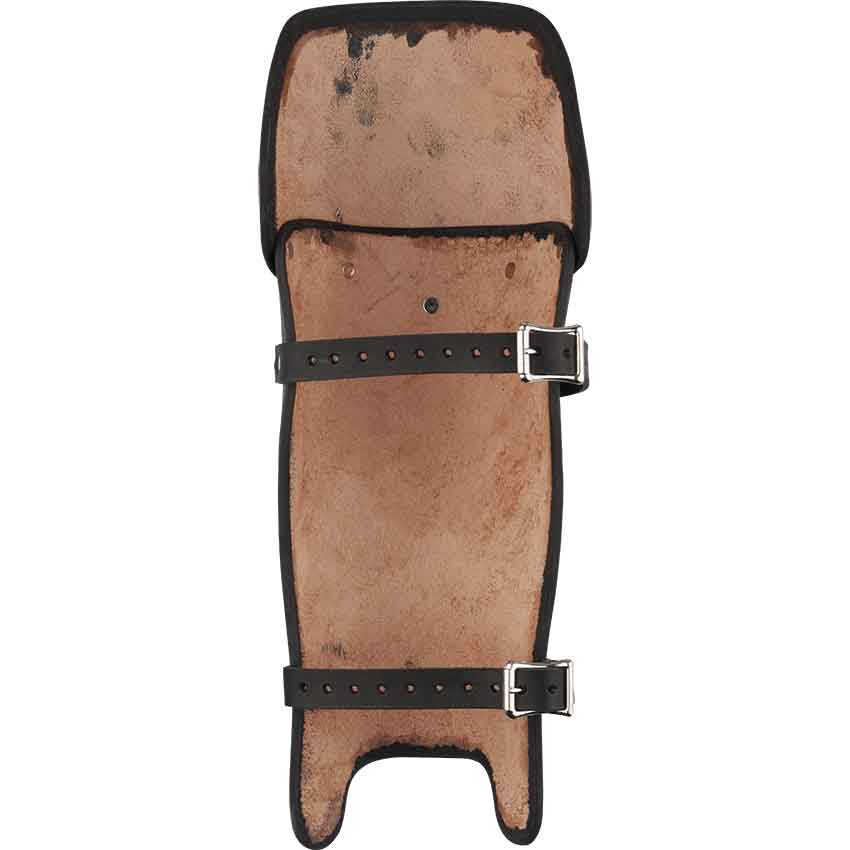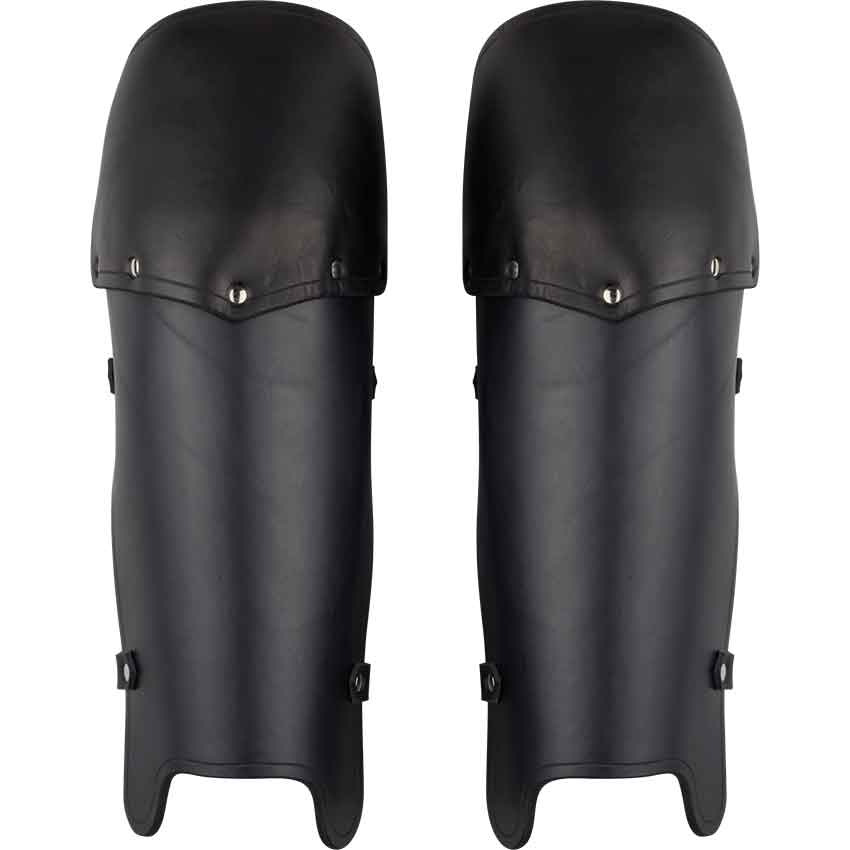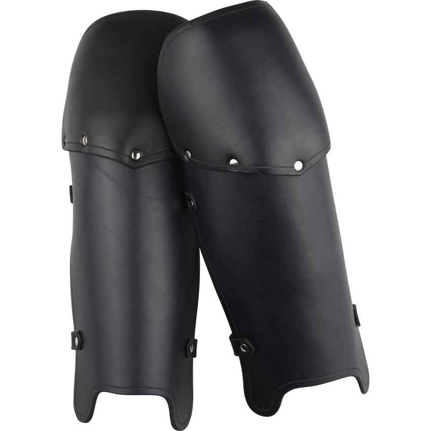 Our Molded Leather Greaves provide excellent protection for the lower leg and knees, the leather is hardened courbouille style and molded to follow the natural curvature of the knee, also providing 180 degree protection. The greaves attach to your leg by straps and buckles. We craft these from 13/15 oz. leather, which is perfect for SCA fighting. They are available in black or brown and are sold as a pair.