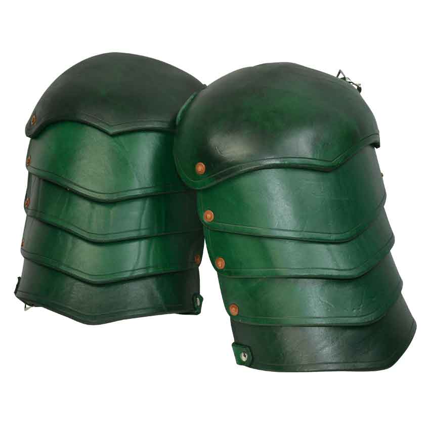 These leather molded spaulders are specially designed and conformed to the shoulder to provide more protection by using a larger section of leather, and using the courbouille hardening method and shaping to cover more area of the shoulder. The pauldrons attach to your body with straps that go around your chest and buckle, so a gorget is not needed when wearing these. Made of thick 13/15 oz. armour grade leather, they provide good protection for reenactment and combat. They are available in black, brown, dark red, blue, and green. These pauldrons are sold as a pair.