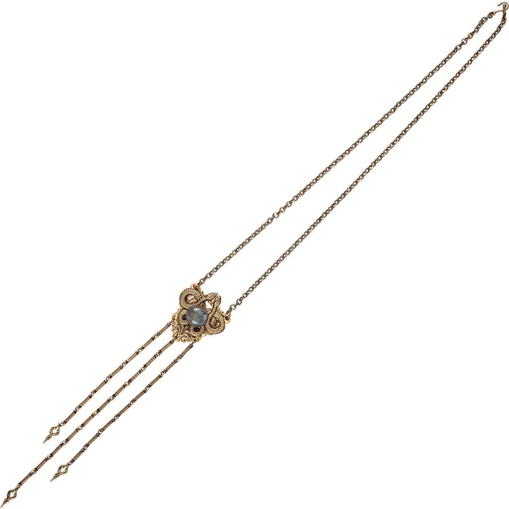 This necklace is inspired by various Wiccan symbols like the moon and serpents. It’s crafted from antiqued brass with a genuine Labradorite gemstone in the pendant. Attached to the pendant is a chain carved to resemble the scales of a snake.