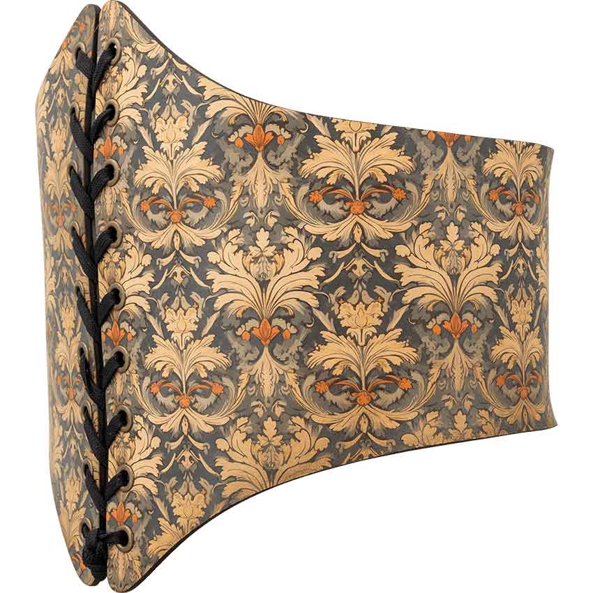 The design depicts damask pattern leaves scattered across a muted blue background. Like a medieval garden, the damask pattern consists of interchanged beige flourishes with orange accents. This medieval fantasy waist cincher is longer in the front than in the back. The front comes to two points, at the center of the top and bottom, to evoke a medieval inspired style. The front helps visually reinforce the narrowness of the waist while flattering the bust and hips.
