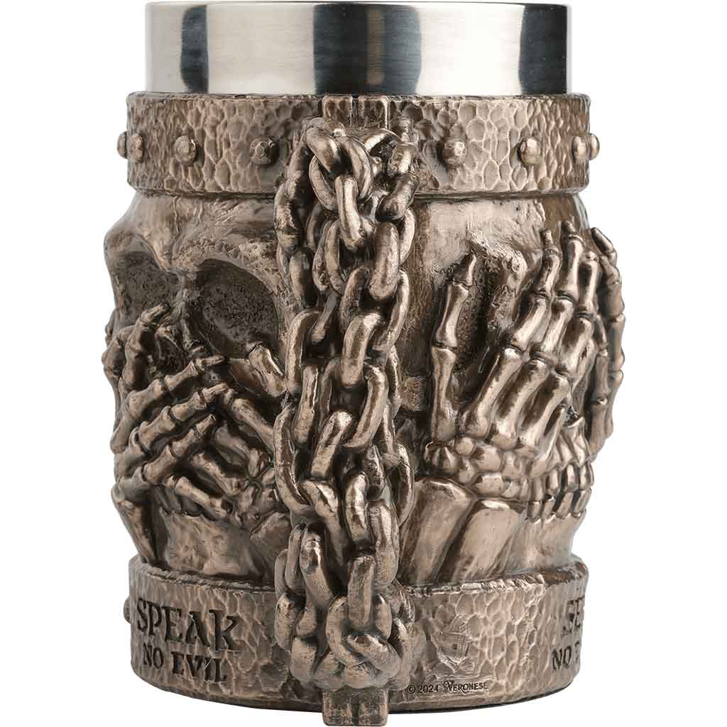 One skull embodies “See No Evil,” and has realistic skeletal hands covering the eye sockets. Another embodies “Hear No Evil,” holding its ears with realistic carved skeletal hands. The last skull embodies “Speak No Evil,” holding its skeletal hands over its mouth. The handle is designed to look like chains. This gives you a secure hold and a unique tactile experience when you sip on your favorite beverage.