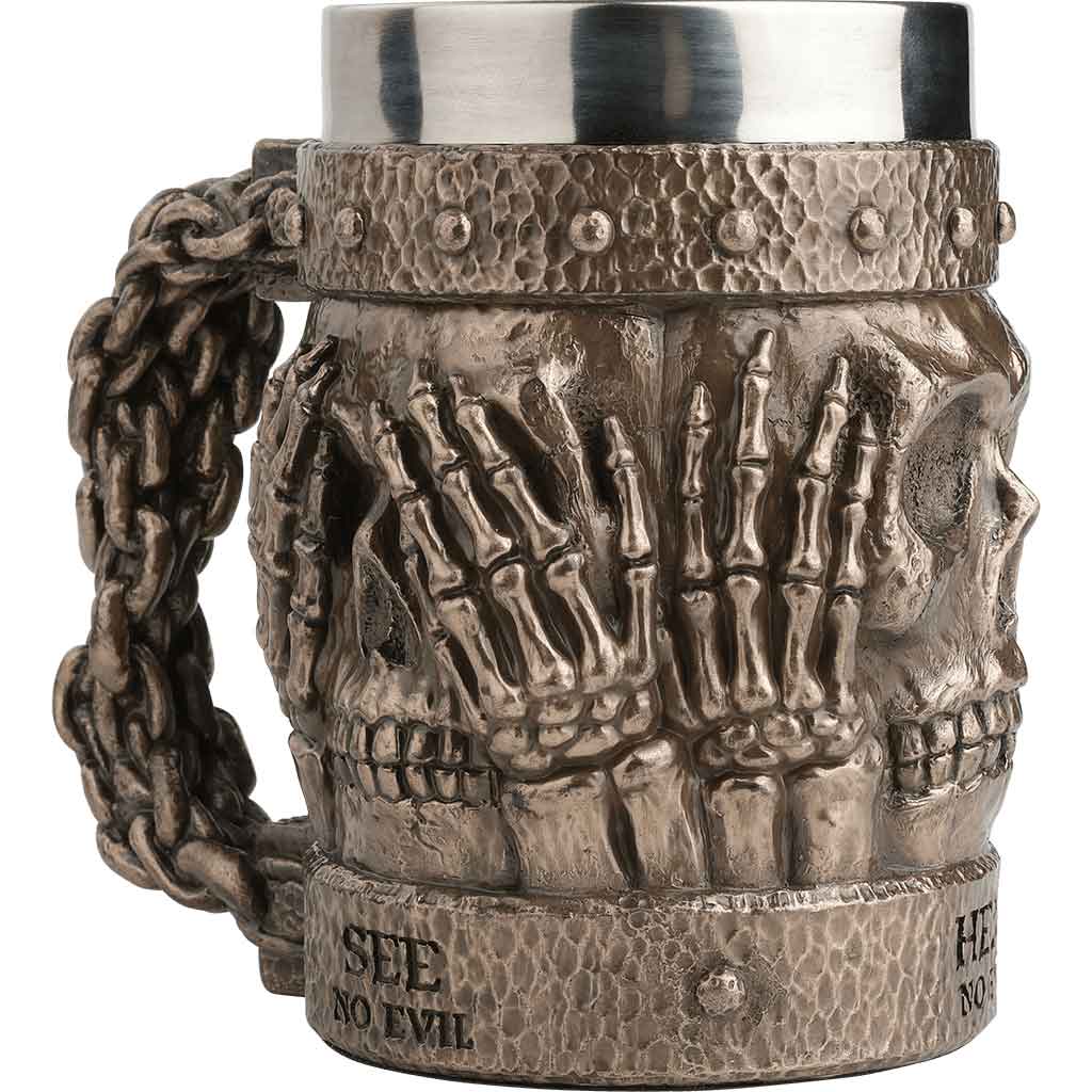 Crafted from cold-cast bronze with a stainless steel insert, this medieval fantasy beer stein is inspired by the adage: “See No Evil, Hear No Evil, Speak No Evil.” Three skulls are on each side of the stein. Each skull has lifelike details. The teeth are asymmetrical, giving each skull a realistic touch. The areas around the eye sockets, cheek bones, and the nose have realistic cracks and sutures carved into them. The eye sockets, the teeth, and the nose have darker shading.