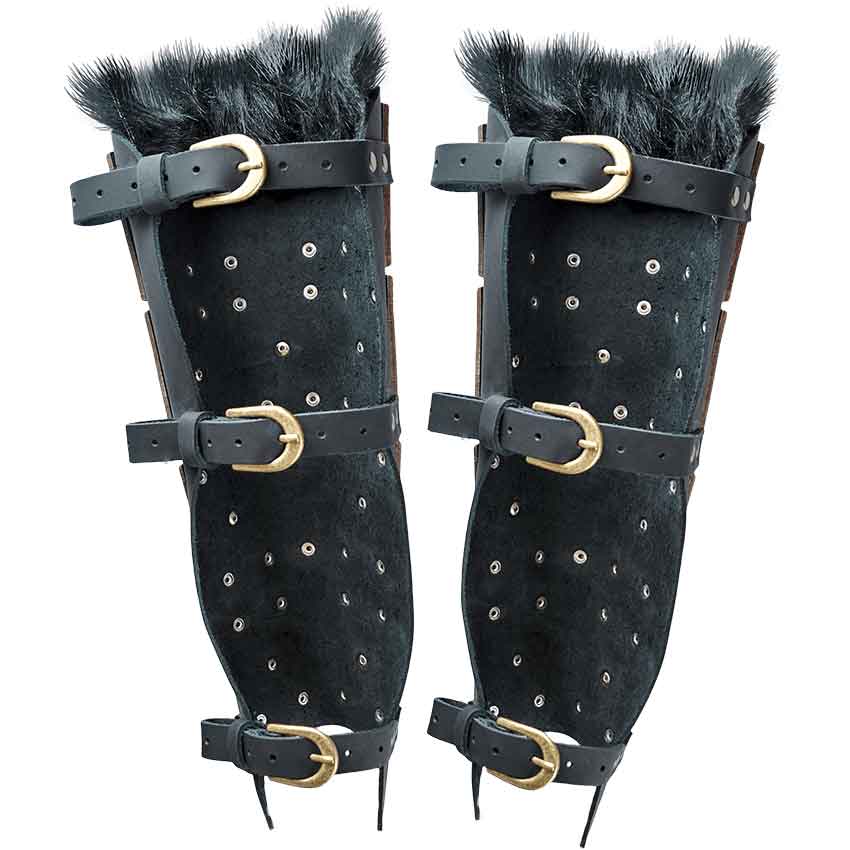 Warriors that are always on the move know the importance of protecting their legs from attack. You wear the Nomad Greaves into battle. Made from 9-10 ounce leather, these greaves come as a pair and in a single size. They secure to the legs with straps and buckles. These bracers feature a black base. The base has a straight top edge and a cutout at the bottom near the ankle for greater mobility. Rivets secure rectangular brown plates to the base. Many of the plates have circle cutouts to show off a rivet in the center. One of the plates has a circular insignia. The insignia is 20 gauge stainless steel. On the inside of the bracers, there is black faux fur along the top edge. It sticks out to create a distinctive look. The Nomad Greaves make a great addition your LARP ensemble, cosplay outfit, or stage costume.