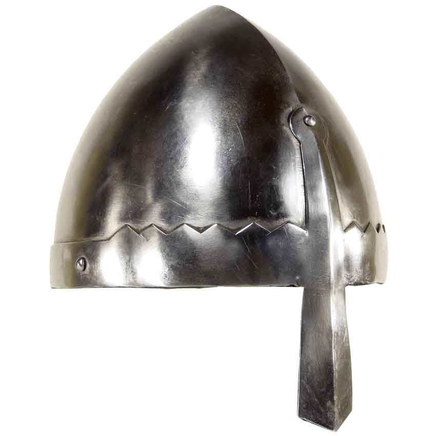 Nothing beats a classic Norman Nasal Helmet when it comes to a classic Viking look. This helmet features a shiny metal finish that makes the helmet all but gleam in the light, while retaining the classic look of a Norman helm. In spite of the helmets shiny appearance, it still features an attractive look that makes it look rugged and worn, though still well-cared for and polished. The helmet is a classic skullcap with a reinforced band around the base, while featuring a crossbar nasal guard that extends down the front of the helmet. The interior of the helm is completely padded and features leather lining, as well as an adjustable chin strap. All and all, this Norman Nasal Helmet is very comfortable and easy to wear, while also keeping your head safe from any number of the blows that might rain down upon it in battle!