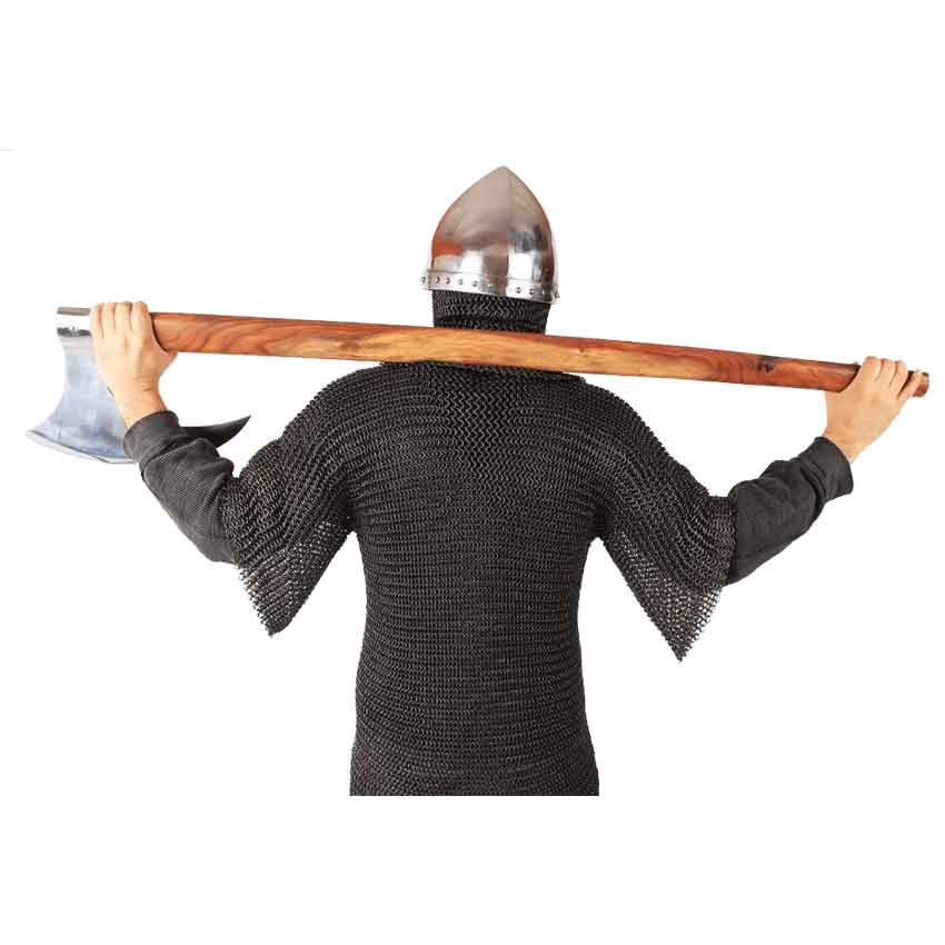 Twin twines of leather wrap around the hardwood haft, adding an extra level of grip to the design, while the haft itself is hardy and thick, ensuring it will stand up to the rigors of combat and swinging. Hardy is a good word to describe this axe, as is deadly. All in all, this Norse Viking Axe is an effective tool for training, as well as a fully functional battle axe for any Viking enthusiast to wield for their next reenactment or demonstration.