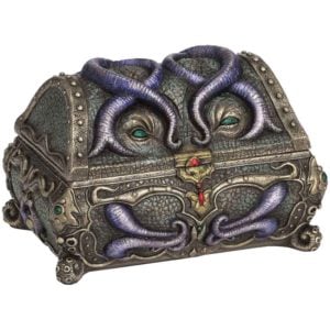 Remind your houseguests to be wary when in the same room as the Octopus Mimic Chest Trinket Box. This shapeshifting monster of the sea seeks to devour any soul that wishes to steal the precious trinkets and gems given to its care. This crafty kraken has taken the form of a miniature treasure chest. Green gems and gold filigree enchant the eye, but beware the purple tentacles that intertwine across the lid and base. Just note the evil twinkle in its green eyes. This malevolent creature is ready to latch onto an unsuspecting victim.
