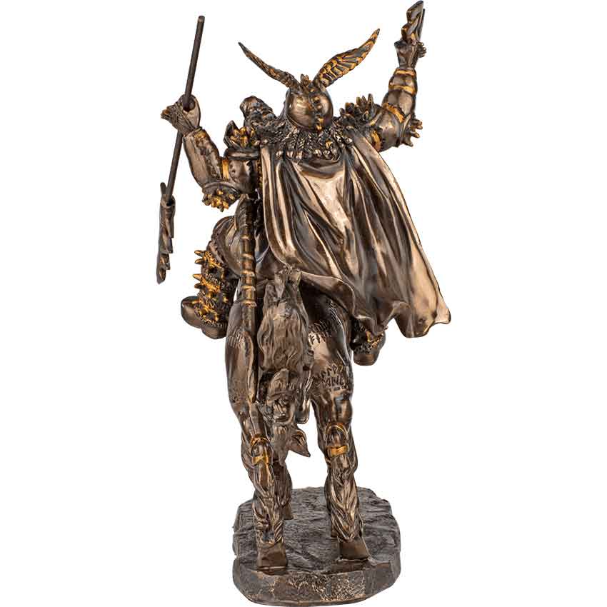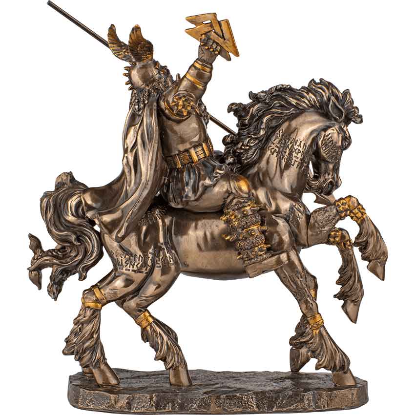 Odin possessed many animal companions, including ravens and hunting hounds, but none were grander than his mighty steed, Sleipnir. In the Odin and Sleipnir Statue, the pair is depicted as Odin gives a cry while riding off to war. Sleipnir is an eight-legged horse, here shown to be covered in runic letterings, with braids in his mane and decorative bands on his legs. Odin is depicted as a powerfully sized warrior wearing full armor and a winged helm. His beard and hair are braided, while his armor features several spikes across its surface. In one hand, he holds a symbol involving three triangles, while in his other he holds his spear, Gungnir, which possesses a decoratively barbed spearhead. This visually stunning piece is made from cold cast bronze and has been hand finished to bring out the detail and shine in its metallic surface. With its powerful look and its intricate details, the Odin and Sleipnir Statue is a great depiction of the leader of the Norse gods, so much so that it makes a great addition to any mythological collection.