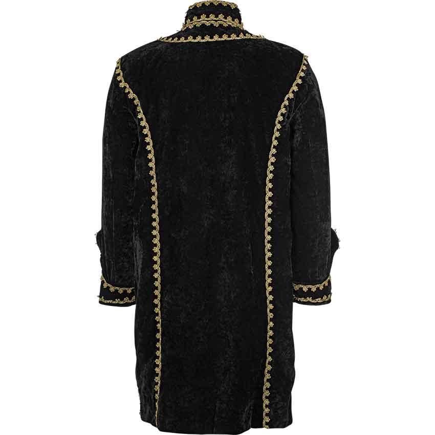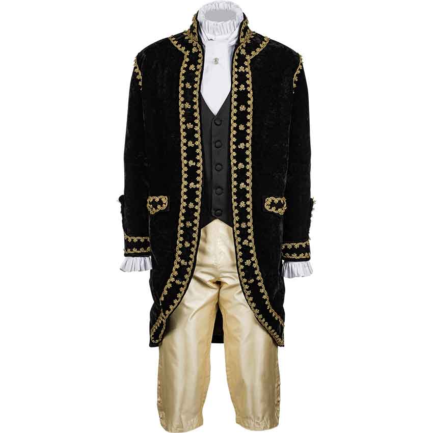 With golden colored lace trim along its collar, hem, lapel, shoulders, and cuffs, the Open Front Baroque Jacket is an example of refined Renaissance grace. This period jacket is made from antique velvet and fully lined for comfort while golden colored lace details decorate its sleeve cuffs, collar, lapel, and hem. With decorative buttons, it is designed to be worn with an open front, ideal for showing off the rest of your Renaissance-inspired outfit. Soft and smooth, the jackets antique velvet construction lends it a subtle touch of luxury without the sheen of other velvet materials. Functional pockets on the jackets sides makes it a practical choice for your next Renaissance festival, reenactment event, or special occasion that calls for elegant historic style. The pants, vest, and shirt shown are not included, so combine the Open Front Baroque Jacket with items like the Mens Brocade Vest (MCI-409) and the Mens Velvet Renaissance Pants (MCI-386) for a distinguished matching look.