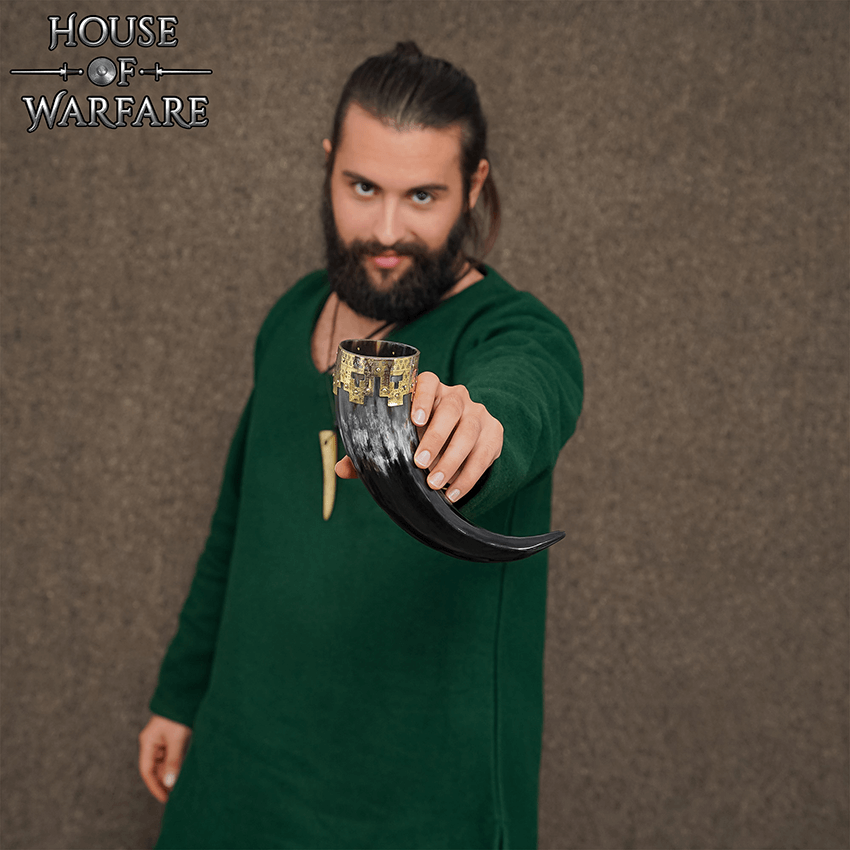 All of your esteemed guests have arrived. You toast them welcome, thanking them for coming, and take a drink out of the Ornate Brass Rim Drinking Horn. Made of natural horn, this drinking horn has a brass rim. The brass rim has a unique, step-like edging. In addition, the brass has cutouts that reveal the horn underneath. This horn is drink safe and wonderful for drinking your preferred beverage. The Ornate Brass Rim Drinking Horn is great for a variety of medieval and Renaissance events such as faires. You can add it to a fantasy outfit or cosplay costume as a unique accessory. It also looks wonderful on display in your home.