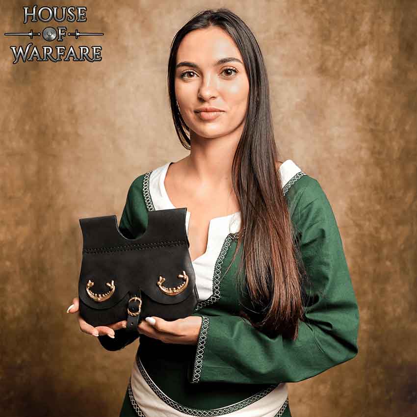If you are looking for something a bit larger than a traditional coin purse, something sizeable enough for the storage of larger trinkets, then perhaps what you need is a kidney pouch, like the Black Ornate Medieval Belt Pouch. This kidney pouch is made of durable black leather to protect your items from the elements. Great for holding keys, wallets, coins, and other small essentials, this medieval leather bag fastens by way of a flap that secures to the front with a brass buckle. This helps keep all your treasures from falling out. On either edge of the flap are ornate, brass-colored accents. The Black Ornate Medieval Belt Pouch has two belt loops for easily attaching to a belt, making it a fantastic accessory for Renaissance fairs, medieval markets, reenactment, and more.