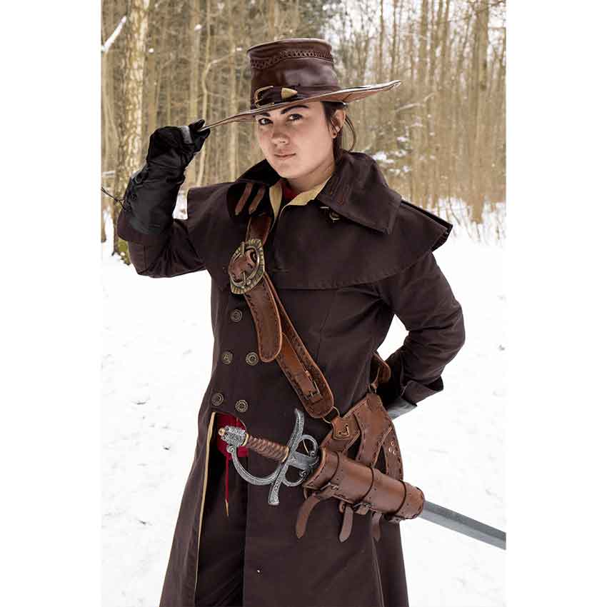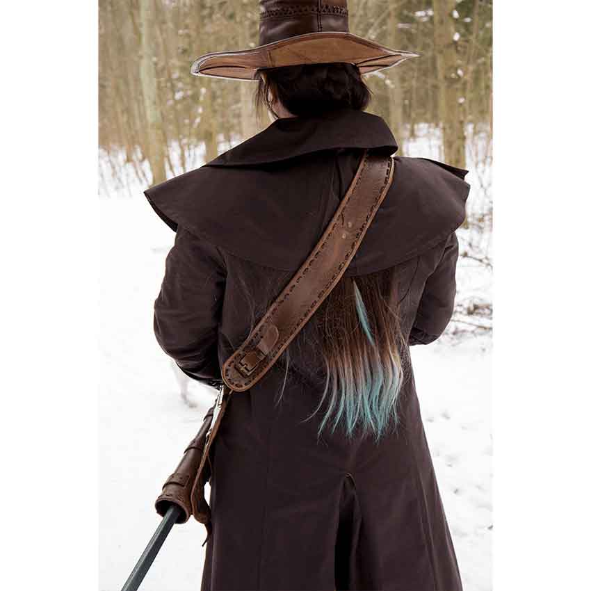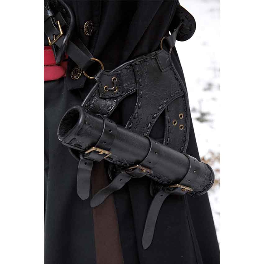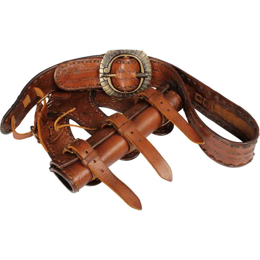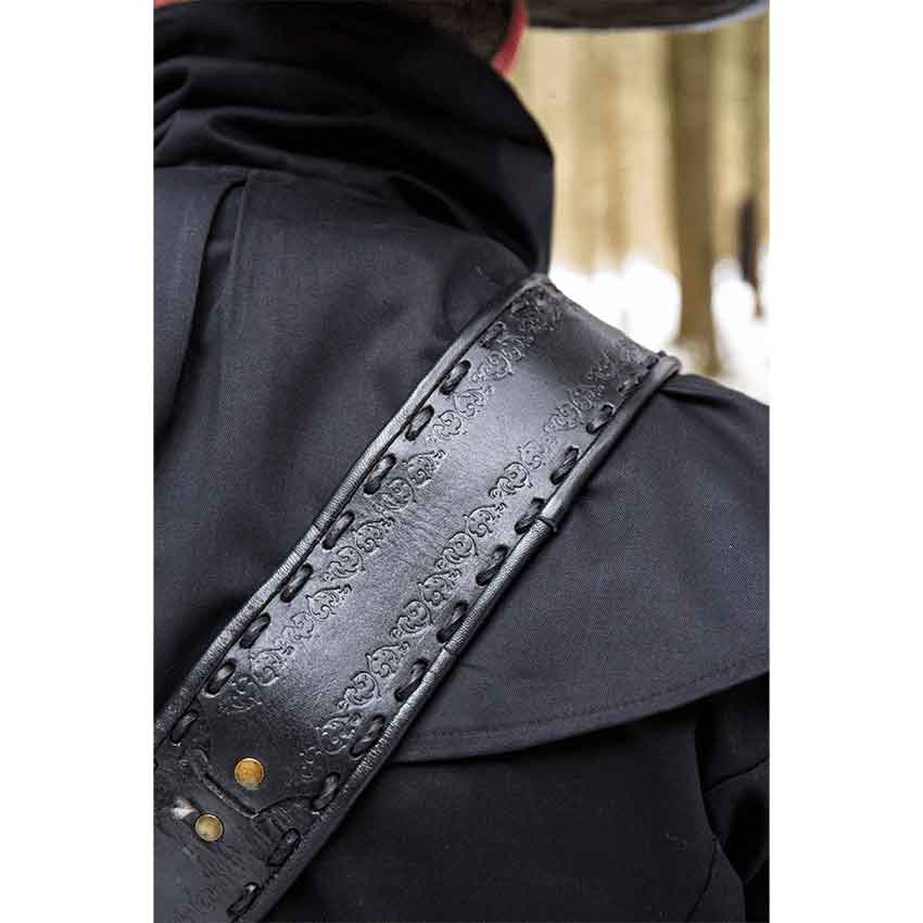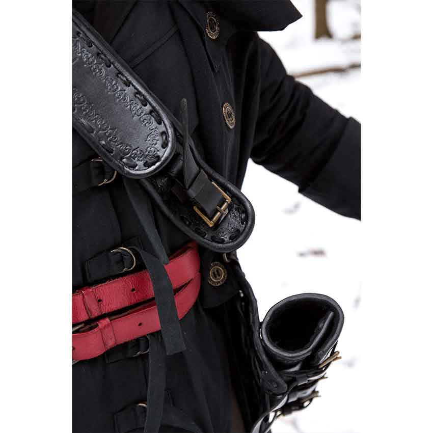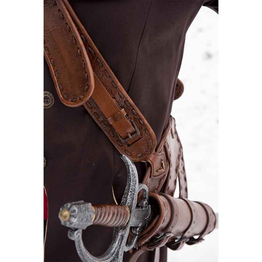 A baldric is more than just a stylish addition to your attire. It is also an effective way to support your weapon, ensuring that no matter where the tides take you, this Pirate Baldric keeps your trusty cutlass or saber ready and waiting at your side! The baldric is made entirely from high quality leather and features a system of straps and buckles that not only fits a pirate style (as well as several others) but also makes the baldric highly adjustable too! It can be made to fit the height you want and need and worn to support a sword on either side with its felt lined scabbard. The buckles on the scabbard even make it adjustable to fit different sizes of swords! The big ornate buckle strapped across your chest is a great way to accent your pirate style, and this Pirate Baldric offers just that, as well as the convenience of securing your saber to your side in true style.