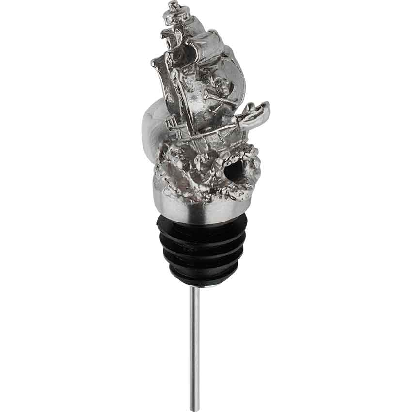 This pirate wine pourer is forged from stainless steel, a material renowned for its durability and rust resistance. The design depicts a silvery pirate ship sailing on the ocean. The pirate ship has intricately carved details. It has the classic Jolly Roger skull and bones symbol on the front sail. The hull of the ship is also realistically segmented. Just underneath, the ocean has intricately carved crashing waves. Please note the hole in this pourer is located in the front of the ocean waves.