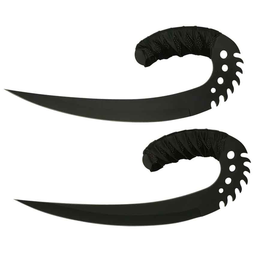 The Pitch Black Saber Claws, also known loosely as ulak, are replicas patterned after the hand-held blades that the convict Riddick used to devastating effect in his escape of the planet Crematoria, during the course of the film Chronicles of Riddick. In the hands of Richard B. Riddick, these claws were devastating weapons, capable of slicing, dicing, and decapitating with ease, giving them a fearsome and well-deserved reputation. These replicas are made entirely from 420J stainless steel, which have been given a blackened finish to really enhance their look. They are, of course, full-tang design and possess ray skin wrapped grips for comfortable, easy, and fun handling. Included with the ulak set is a magnetic base that is perfect for holding and displaying them when you are not busy enjoying how they feel in-hand. Riddick put these wicked weapons to good use when they fell into his hands, and now, you can do the same, just as soon as you pick up a pair of your own Pitch Black Saber Claws.