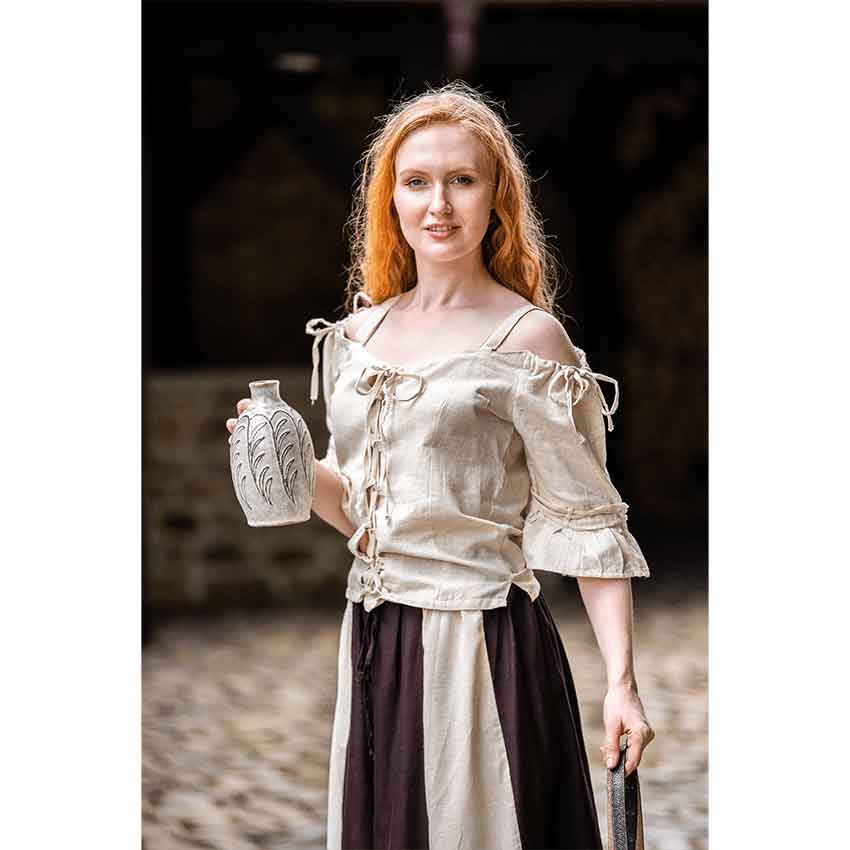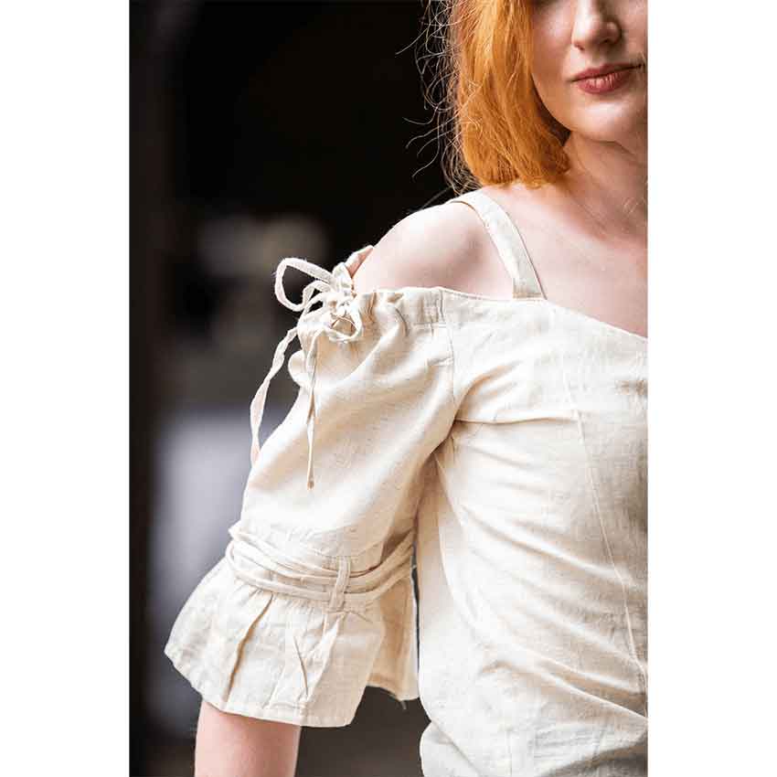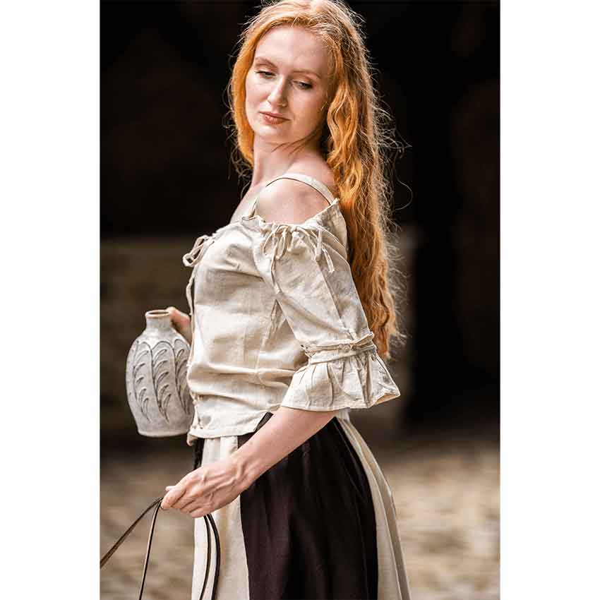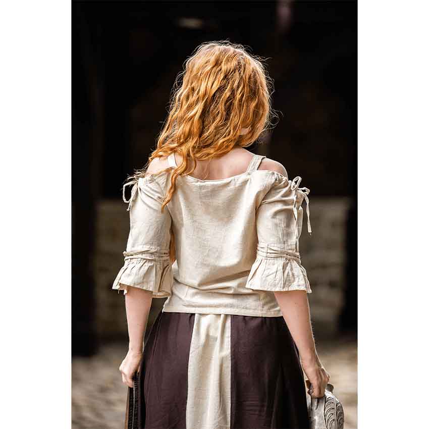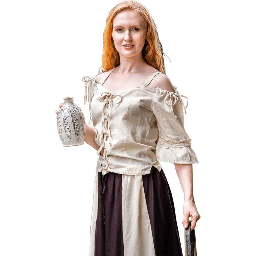 Crafted from a cotton blend, this medieval blouse is a comfortable and breathable companion for your adventures. Starting at the top, this Prina blouse has an off-shoulder neckline with shoulder straps. While this medieval blouse is designed to have a looser fit, the torso has princess seams for a flattering look. This medieval fantasy blouse comes in a natural beige color, perfect for styling with any tavern keeper or intrepid maiden outfit. Lacing and drawstrings along the shoulders ensures you can get the perfect fit.