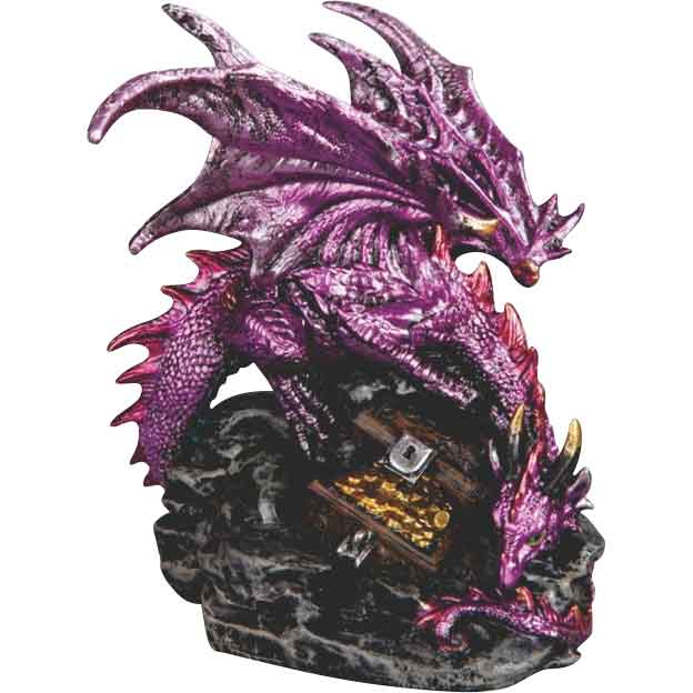 In the heart of its lair, the Purple Dragon Guarding Treasure Statue awaits. Dare to trespass into its treasure hoard as you show off this statue in your collection and to your guests.