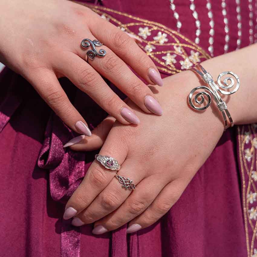 The Purple Dual Triquetra Steel Ring is a lovely choice for anyone who loves Celtic-styled accessories, especially ones with a purple gem. Made from stainless steel, this ring comes in five sizes. It features a band that widens near the top. As it widens, it features a cutout triquetra design on each side. The triquetras sit on each side of an oval, lavender cubic zirconia gemstone. This ring makes a wonderful addition to any jewelry collection or everyday outfit.