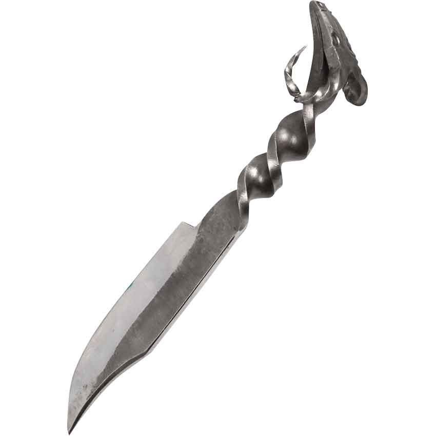 When dining within the confines of a historical setting, the Ram Feasting Knife contributes to the authentic atmosphere. Its curved blade serves a utilitarian purpose, while the ram head at the end of the handle adds a decorative touch. hand-forged from steel, this medieval eating utensil has a twisted grip with dark, rustic finish. The curved, pointed tip of the blade is suitable for stabbing food, while its broad edge creates clean cuts. This single-edged blade not only assists the roleplayer when dining, but proves useful for daily survival tasks.