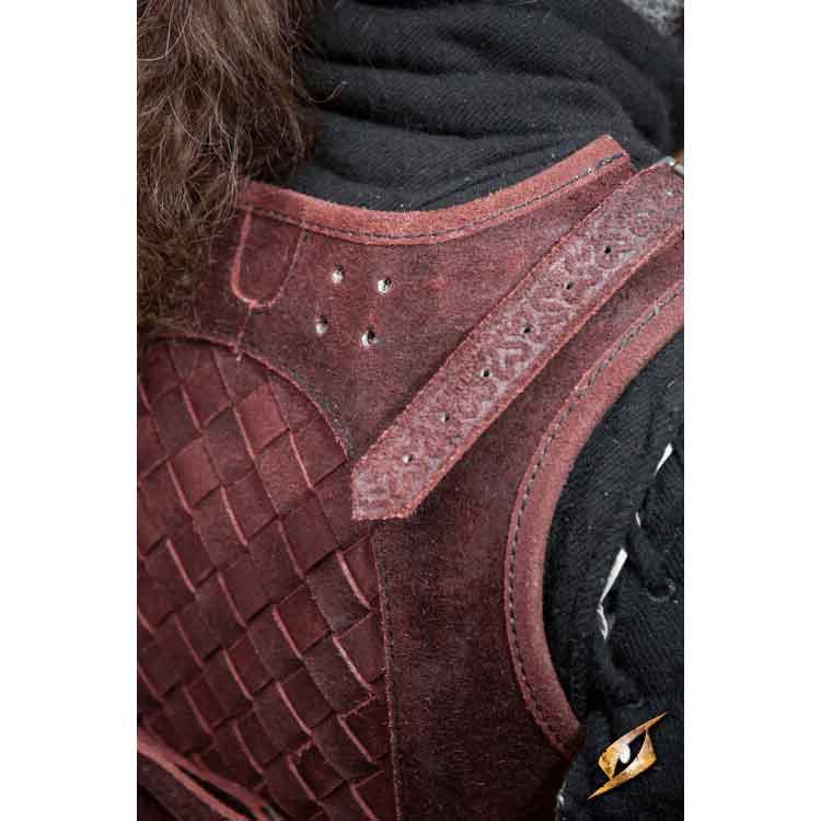 At the top, the cuirass has a round neckline with pairs of pre-punched holes in front and back. These are designed to attach to the pauldrons (MCI-4044), sold separately. These are great for arming points, cords meant to attach different components of armour together. Down the front, this medieval leather armour has a front panel that tapers to a round point at the bottom for a flattering silhouette, complete with concave edges near the arms for greater mobility. On each side of the torso are strips of suede woven in a square pattern, securing and bolstering the others. There are two straps at the bottom sides for attaching the tassets (MCI-4046), sold separately. Moving toward the back, there is a matching arched panel of woven strips to complement the design. There are four straps that buckle around the small of your back. You need to enlist the help of a squire or another ally to secure them.