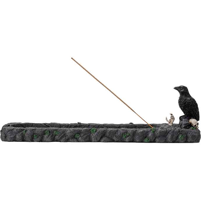 At one end of the incense holder, a raven sits on top of a sunken gravestone. A skeletal hand sticks out of the grave in front of the black bird. Just below the hand in the tray, there is a hole for holding a stick of incense. Incense does not come included with the gothic home decor piece. This dark grey incense burner adds a unique atmosphere to any gothic decor.