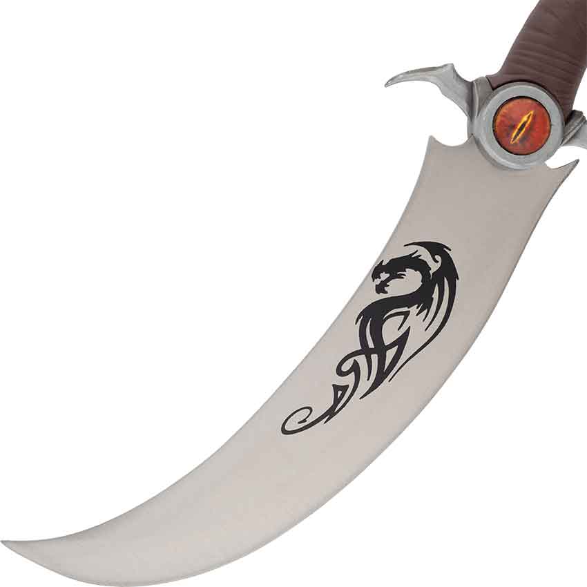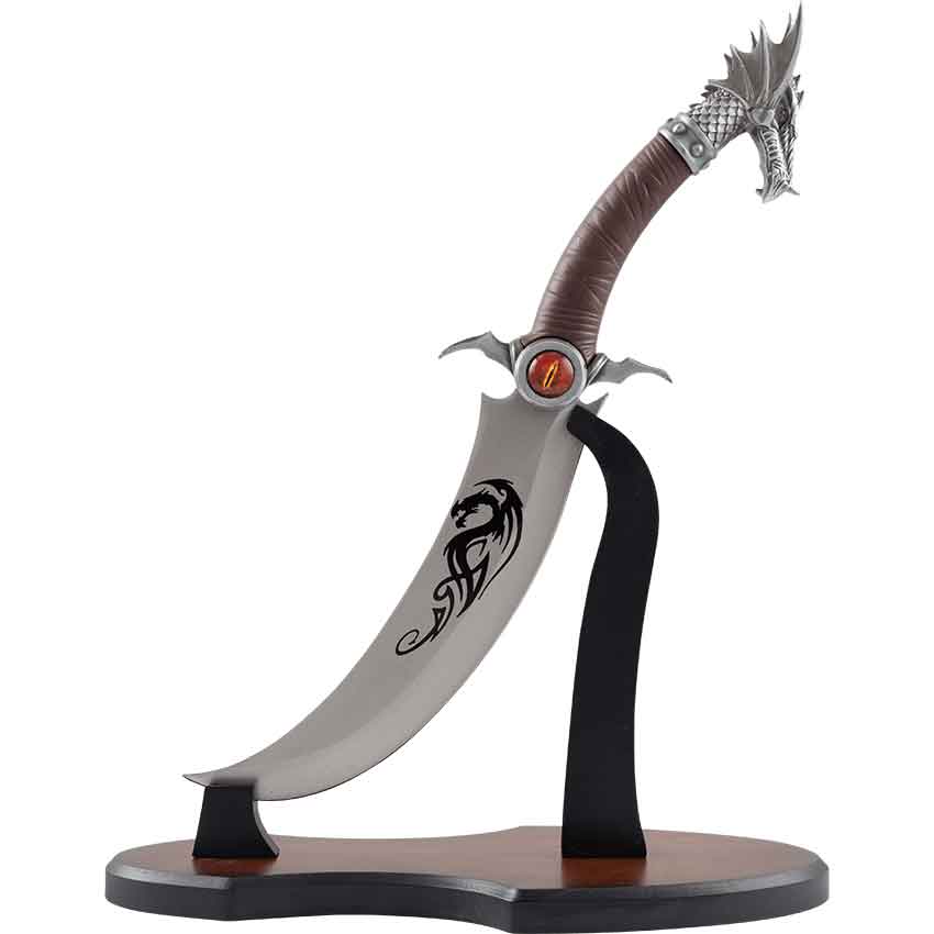 Upon entering your home, you spy the Red Eye Dragon Fantasy Dagger hanging on your wall, declaring to all your sense of style. Made from stainless steel, this decorative fantasy dagger features a curved, single-edged blade. A black dragon design adorns the center of the blade. There are a pair of concave curves at the base of the blade.