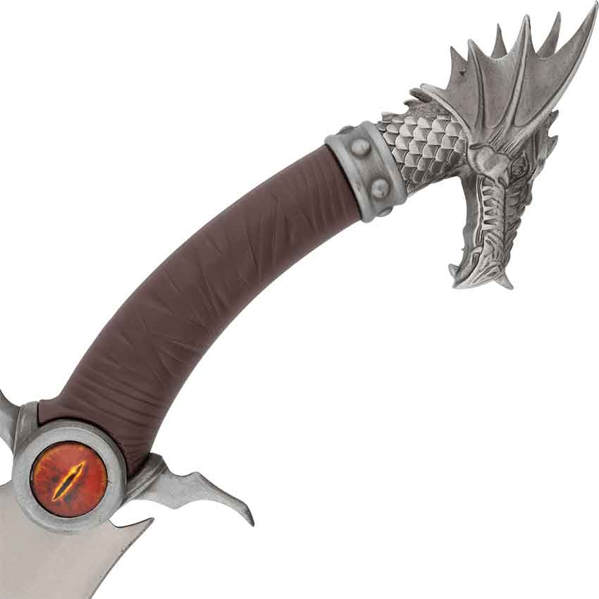 Then, the hilt has a curved ABS handle. The brown, textured handle ends with a silver pommel. This pommel takes the form of a dragons head, complete with scales along its neck. Its highly detailed visage faces towards the edge side of the dagger.