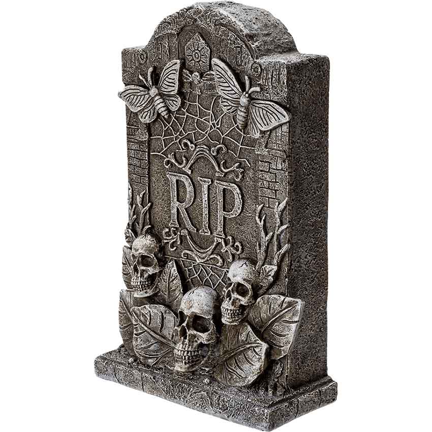 Crafted from polyresin, every detail on this tombstone statue has been painted by hand to show off a true passion for art. The design depicts a tombstone decorated with skulls and moths. The entire tombstone is painted with a grey finish to resemble ancient stone. Two moths with realistic details look like they’re fluttering around the top. These moths have realistic wings, antennae, and segmented abdomens. Below the moths is an intricately carved spider web. The center front of the tombstone reads “RIP,” standing for “Rest In Peace.”