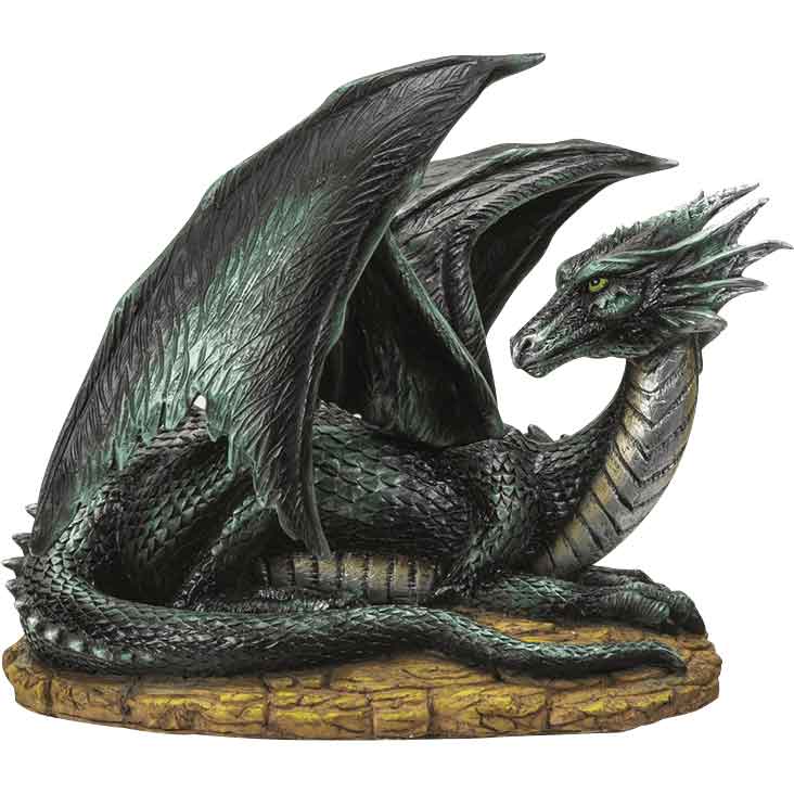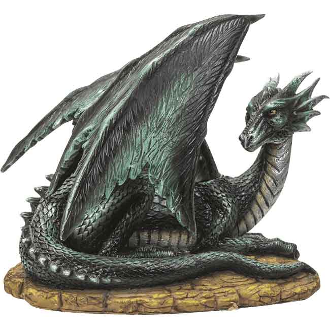 Keeping watch over its domain, the Resting Dark Green Dragon Statue remains relaxed, yet ready to defend its territory. The dragon has claimed your home as a part of its nest. Made from cold-cast resin, this hand-painted dragon is lying down on a section of tan, stony ground. The horned dragon has a dark green body with lighter green highlighting. The dragons tail curls alongside its body. Meanwhile, its lifted, horned head looks beyond its wings and tail. It holds up its wings, curled over its body. This dragon will happily join any dragon decor or fantasy collection. The fantasy statue also makes a great gift for any fantasy fan.