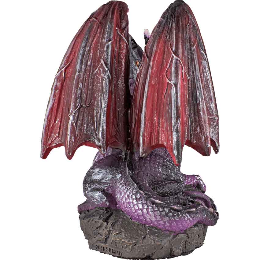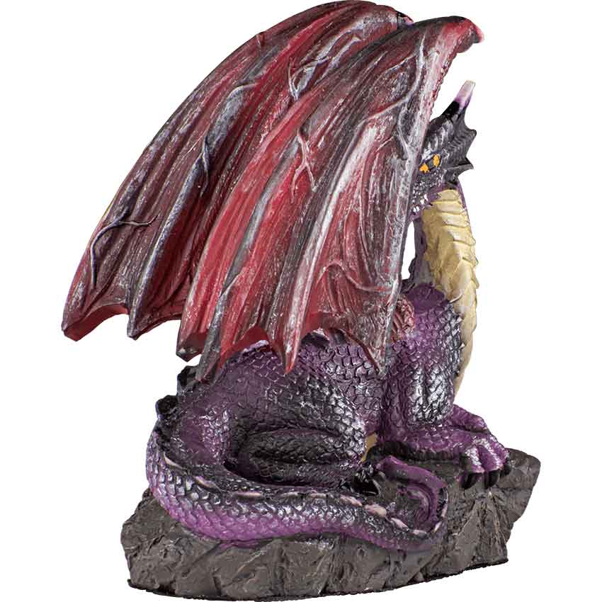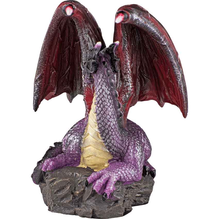On very rare occasions, you can find a dragon that is completely at rest. It is not raging, it is not burning things, and it is not being threatening. The Resting Purple Dragon Statue depicts such a rare occasion, when a dragon is calm and relaxed. This simple yet attractive statue proudly displays an elegant purple dragon resting on a rock, which makes up the base of this statue. The dragon is placid and calm, and it does not look to be disturbed or aggressive, or at least, any more aggressive than a dragon typically looks. The dragons scales are colored a deep purple and feature black accents in places. Black plates form a line down the dragons neck and run the length of the dragons body, down to the end of its tail, while the wings possess gray scales and red membranes. Black frills and black-white horns adorn the dragons head. This wonderful dragon statue is made from cold cast resin, and it has been hand painted in order to highlight the statues magnificent details. It measures 3 inches long and 3.5 inches wide at the base, and it stands approximately 3.5 inches in height. Dragon collectors and dragon enthusiasts of all types are sure to want the Resting Purple Dragon Statue, as its convenient size ensures that it can go anywhere, from desks to tables to shelves, while the appearance makes it a stellar draconic decoration.